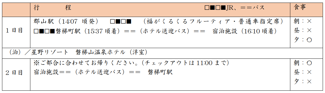 コース名 :≪福がくるくるフルーティア貸切乗車と星野リゾート 磐梯山温泉ホテルフリープラン2日間≫