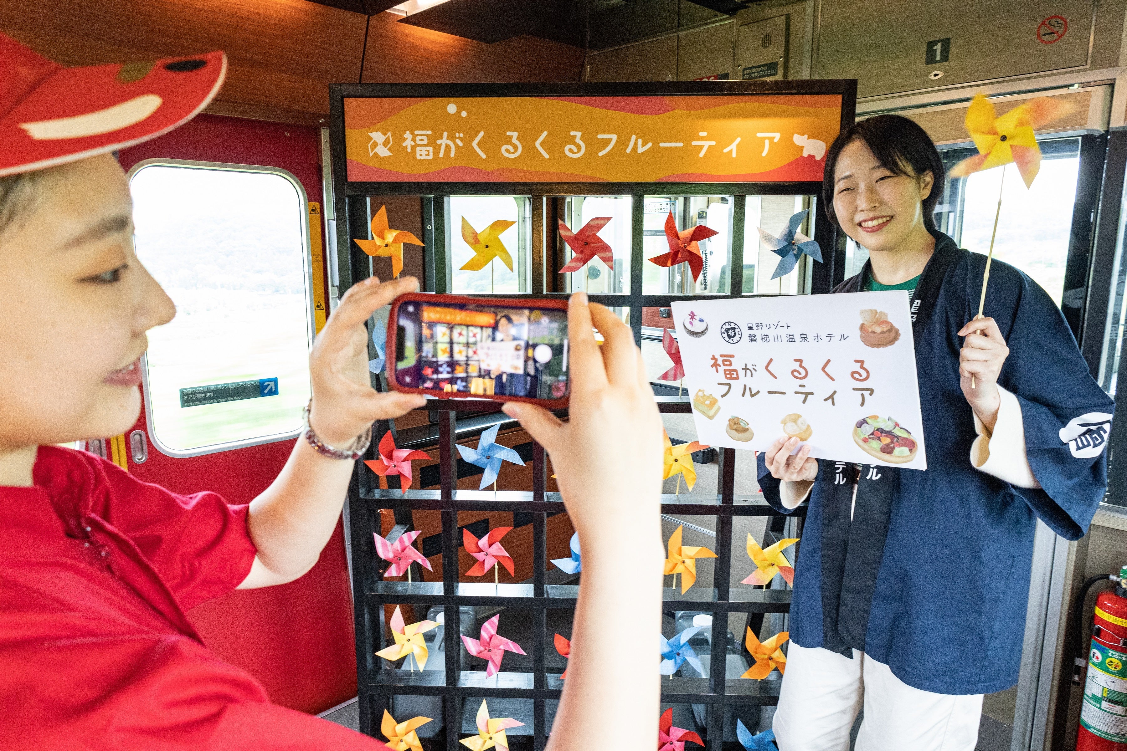 ラストイヤーとなるフルーティアふくしまの思い出をたくさん持ち帰って欲しいという想いから、当列車限定のお土産をご用意しました。かざぐるまをモチーフにしたオリジナルのフォトブースを車内に設置し、ブースで撮影した写真を使った乗車記念のフォトスタンドをお渡しします。また、車内で茶葉とドライフルーツを掛け合わせて楽しむフルーツティー作り体験を実施します。お茶を飲むタンブラーは本列車オリジナルのもので、こちらもお土産として持ち帰ることができます。