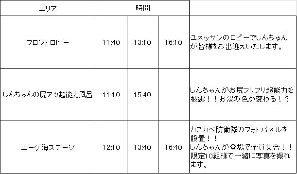 ユネッサンに毎日しんちゃんが遊びに来ます!しんちゃんが登場するのはユネッサンロビー、「しんちゃんの尻アツ超能力風呂」、エーゲ海のステージの三ケ所。ユネッサンロビーでは皆様をお出迎え!「しんちゃんの尻アツ超能力風呂」では「尻アツ」な超能力を披露!!お湯の色が変わる!?ユネッサンドーム内のステージではカスカベ防衛隊のパネルをフォトスポットにしんちゃんが登場!!是非しんちゃんと一緒に写真を撮ってください!箱根ホテル小涌園のロビーにもしんちゃんが遊びに!?