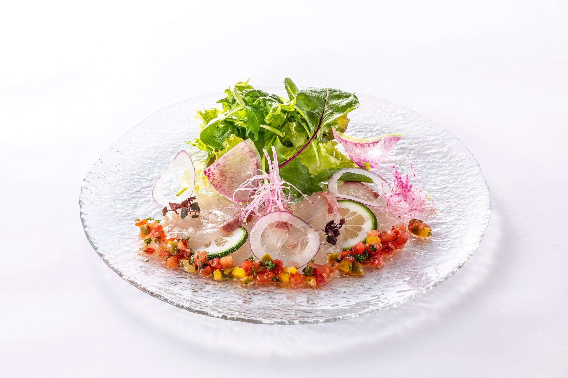 深堀隆介《緋ノ魚》をイメージしました。かぼすの爽やかな香りと、カンパチのマリアージュをお楽しみください。