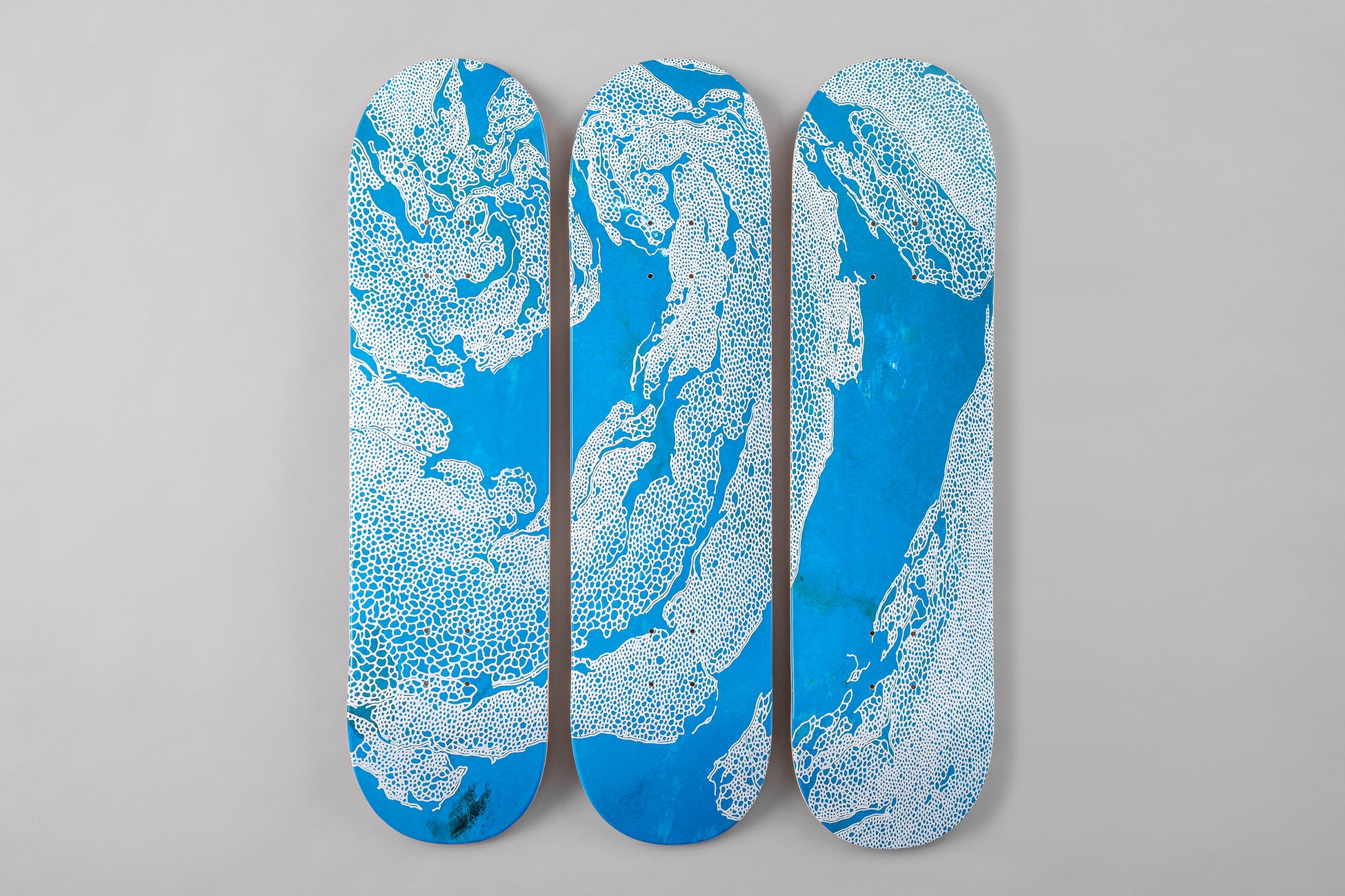 山本基《時を纏う》を全面にプリントしたデッキです。色の再現性の高いデジタルプリントで、繊細な模様や濃淡、白と青のコントラストを丁寧に表現しました。裏面にはPOLA MUSEUM OF ARTのロゴが印字されています。