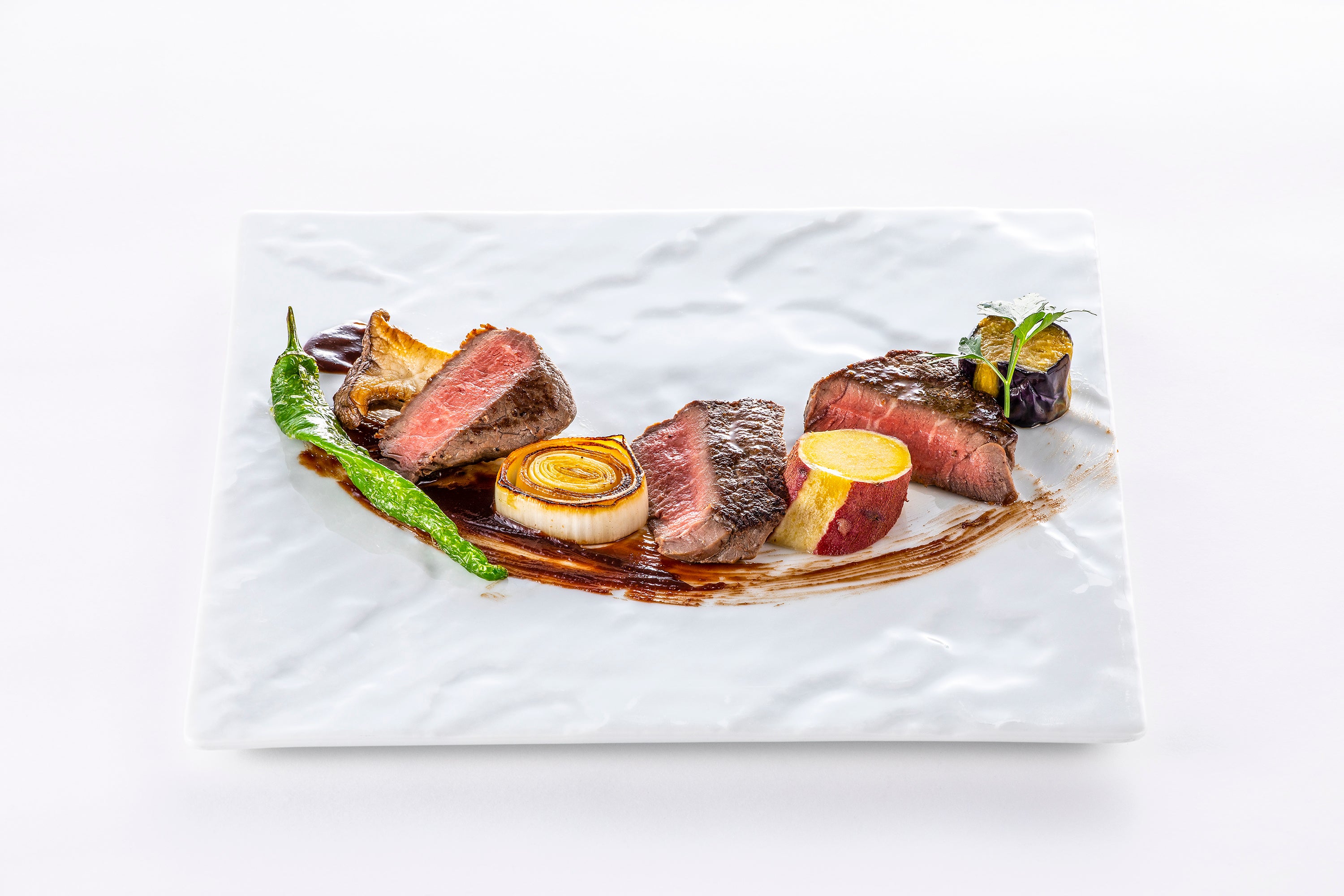 赤身のヒレを丁寧にポワレし、濃厚な味噌風味の赤ワインソースに合わせました。三瀬夏之介《日本の絵》をイメージした一皿です。