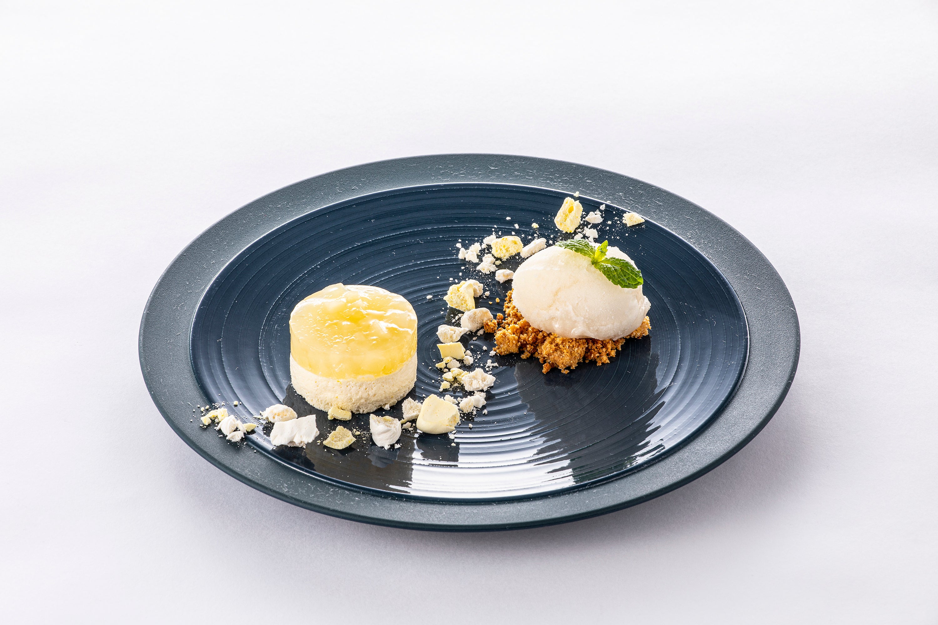 山本基《時を纏う》をイメージし、箱根の日本酒で作った洋梨のゼリーを豆腐のムースに仕立てました。塩味のきいたメレンゲをアクセントにどうぞ。