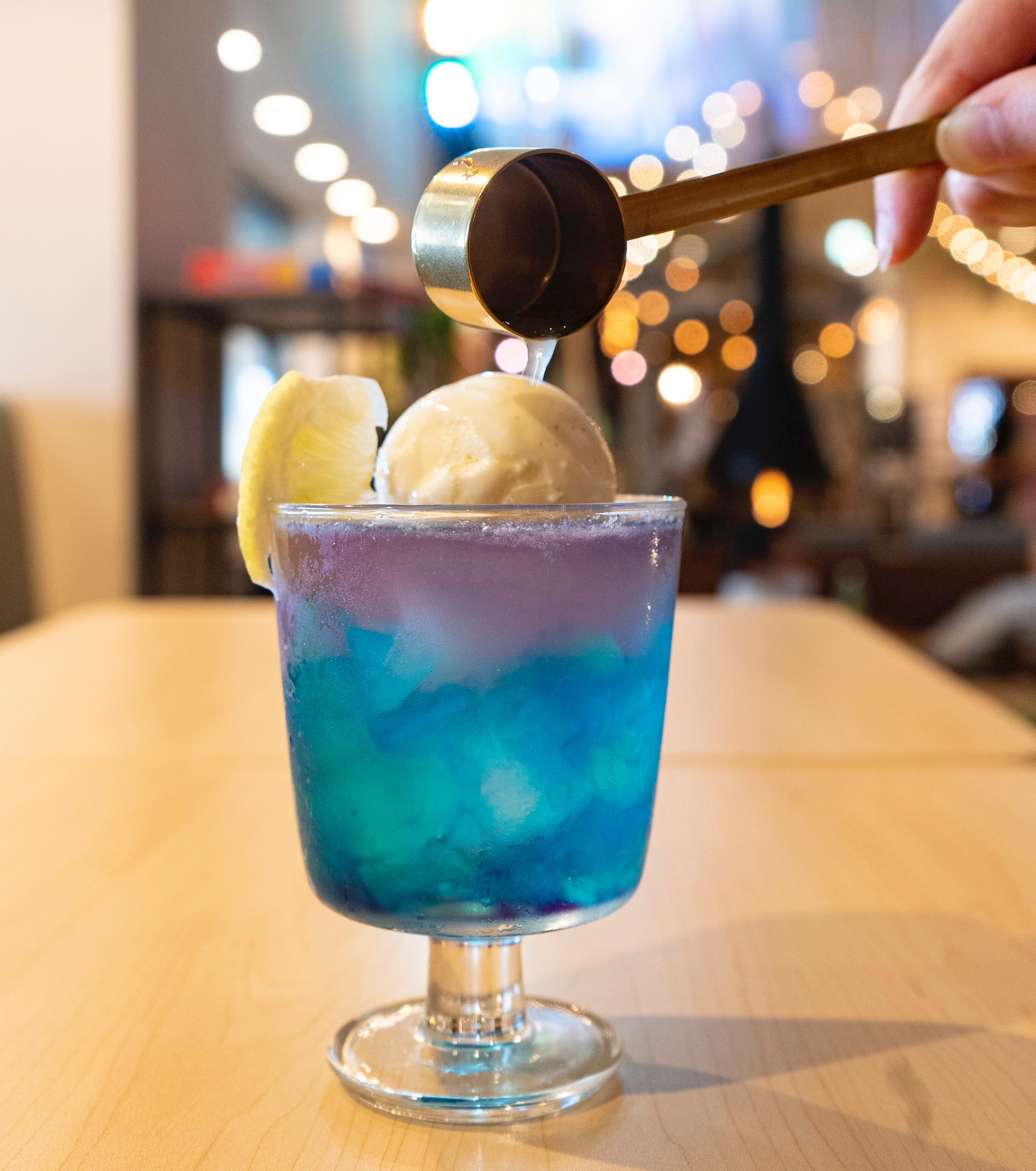 サウナの本場フィンランドのオーロラをイメージしたutataneのオリジナルドリンク「オーロラクリームソーダ」をハレニワの湯でも提供。