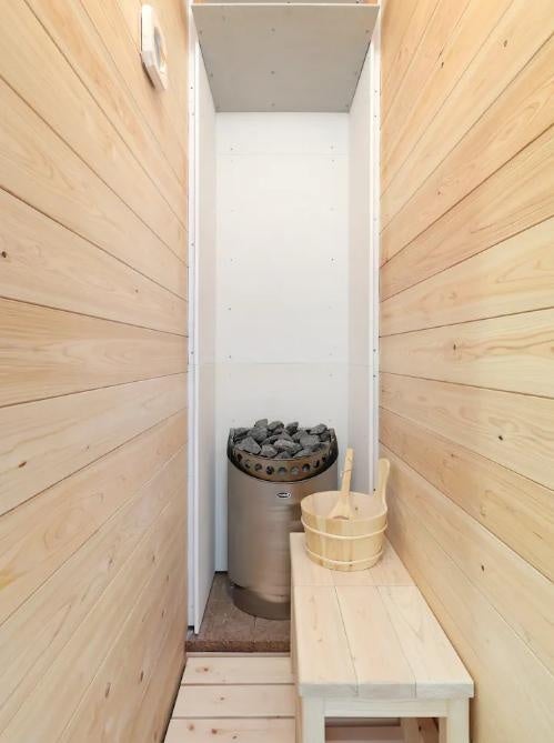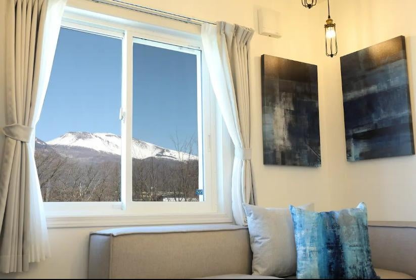 私たちは、大自然を満喫できるように、多くの窓を設計しました。雄大な浅間山を見ながら、ゆったりとくつろげるように大きなソファを配置しています。またプライベートミニサウナがあり整えます。
