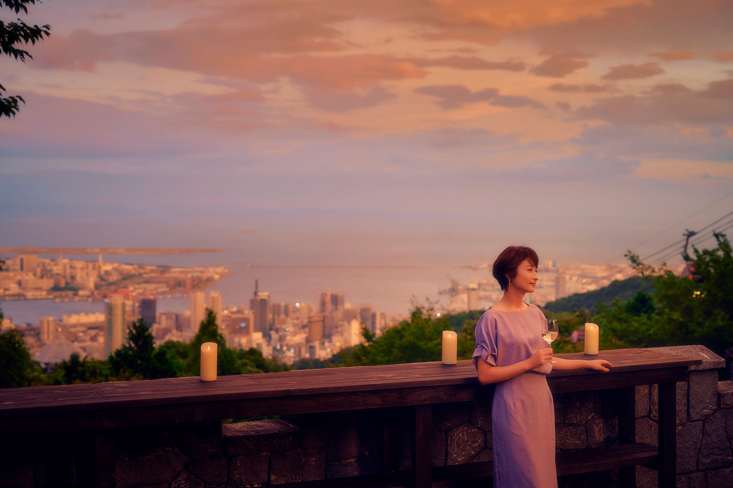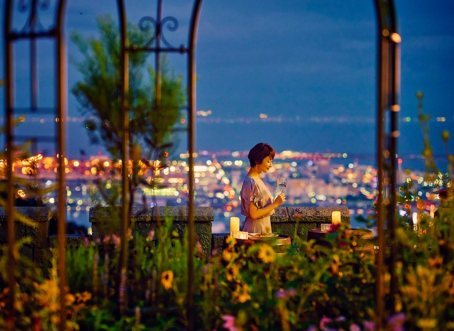 神戸の街を見下ろす「バーカウンター」、幻想的な「展望プラザ」。好きな場所で、好きな時間に思い思いに過ごせるのが神戸布引ハーブ園です