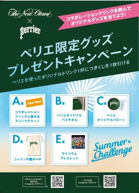 上記コラボレーションドリンクご注文で、ロゴ入りバスタオルやプールで使えるビーチボールなど、Perrier(ペリエ)の限定グッズが当たるキャンペーンも実施中。コラボレーションドリンクを飲んで、限定グッズをゲットしよう!