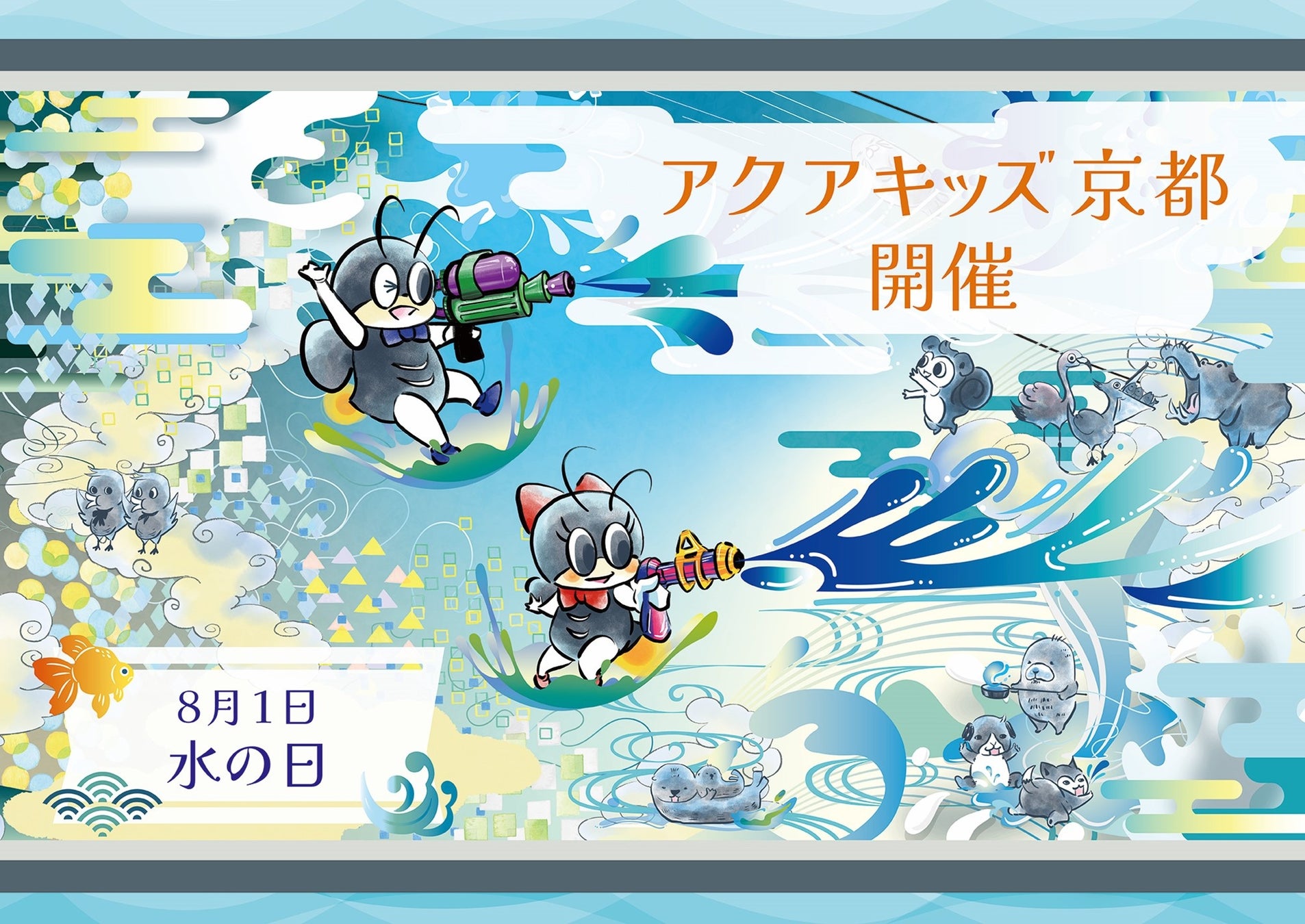 今回は、8月1日(火)の「水の日」に合わせ、 京都アクアリーナ(西京極総合運動公園プール)で、水鉄砲を使ったゲームや水にまつわるクイズなどを京都市上下水道マスコットキャラクター「すみとくん&ひかりちゃん」と一緒に実施するイベント「アクアキッズ京都」を開催します。