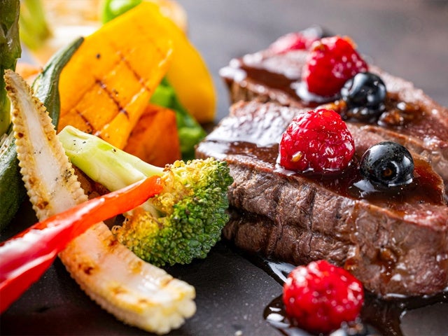 肉の皿(熟成和牛のステーキ 特製シャリアピンソース 鹿肉のロースト 果実のソース)