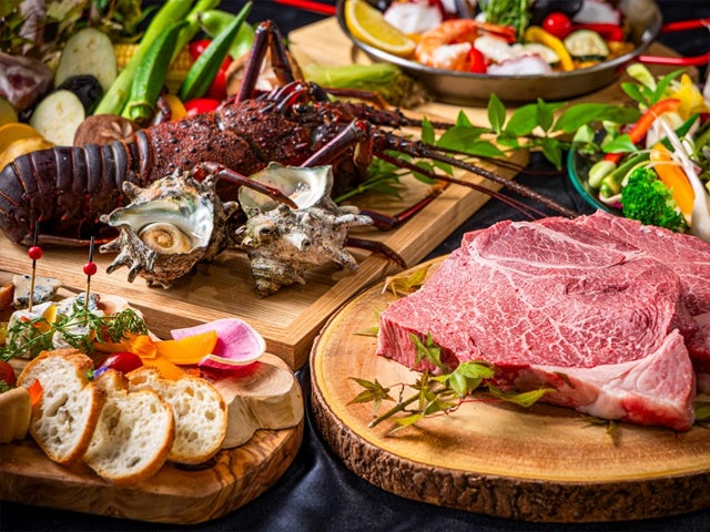 メニュー:厳選牛のステーキ、伊勢海老と房州産サザエのグリル、旬野菜のグリル、ハマグリとブラウンマッシュルームのアヒージョ、魚介のパエリア、本日のオードブル盛り合わせ(魚介類のマリネ、季節のキッシュ、2種類のチーズ盛り合わせ、スモークサーモンのクリームチーズ巻き、生ハムといちじく)、2種のパン(バケット、ライ麦ロール)、本日のデザート、コーヒー