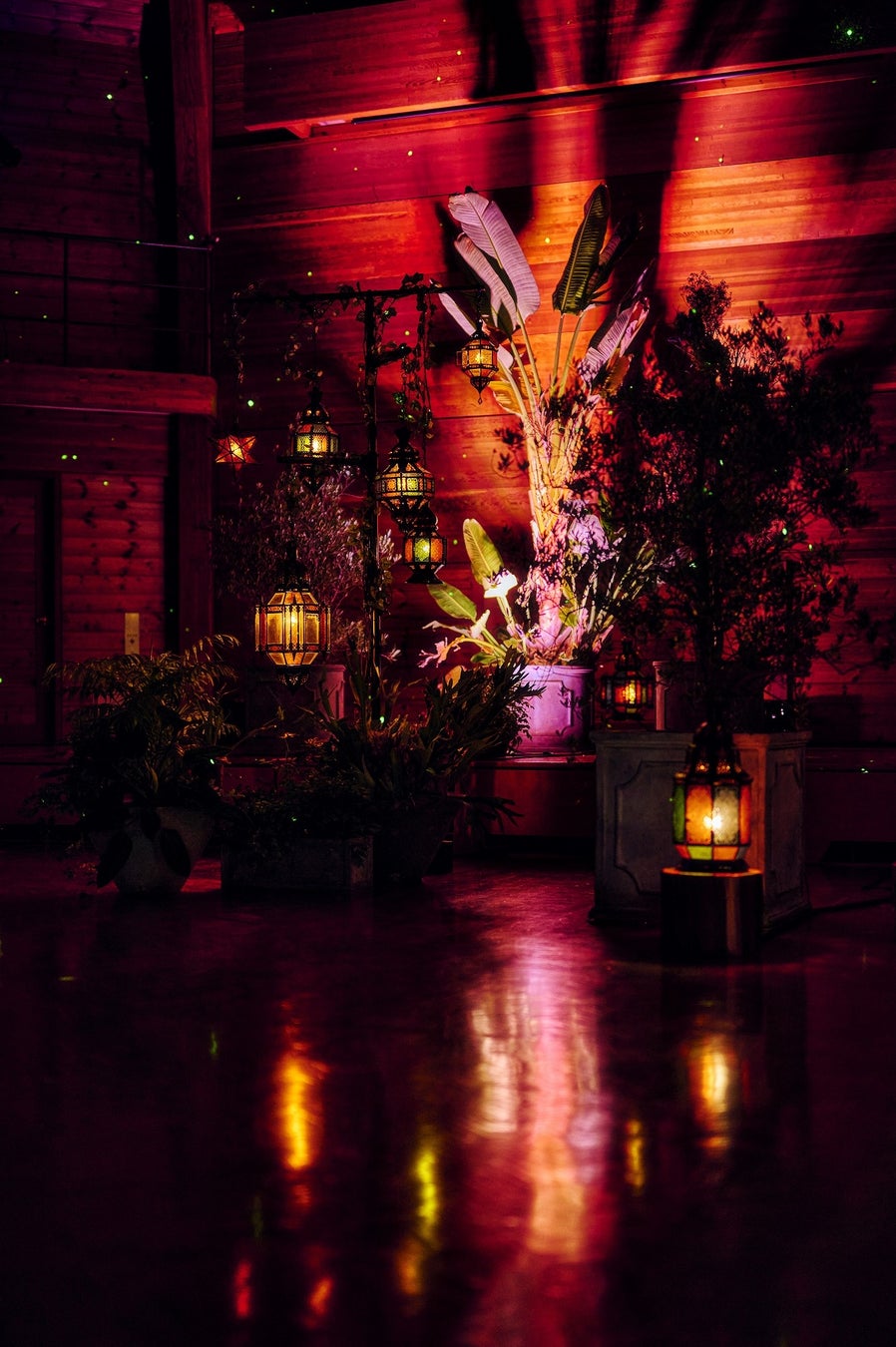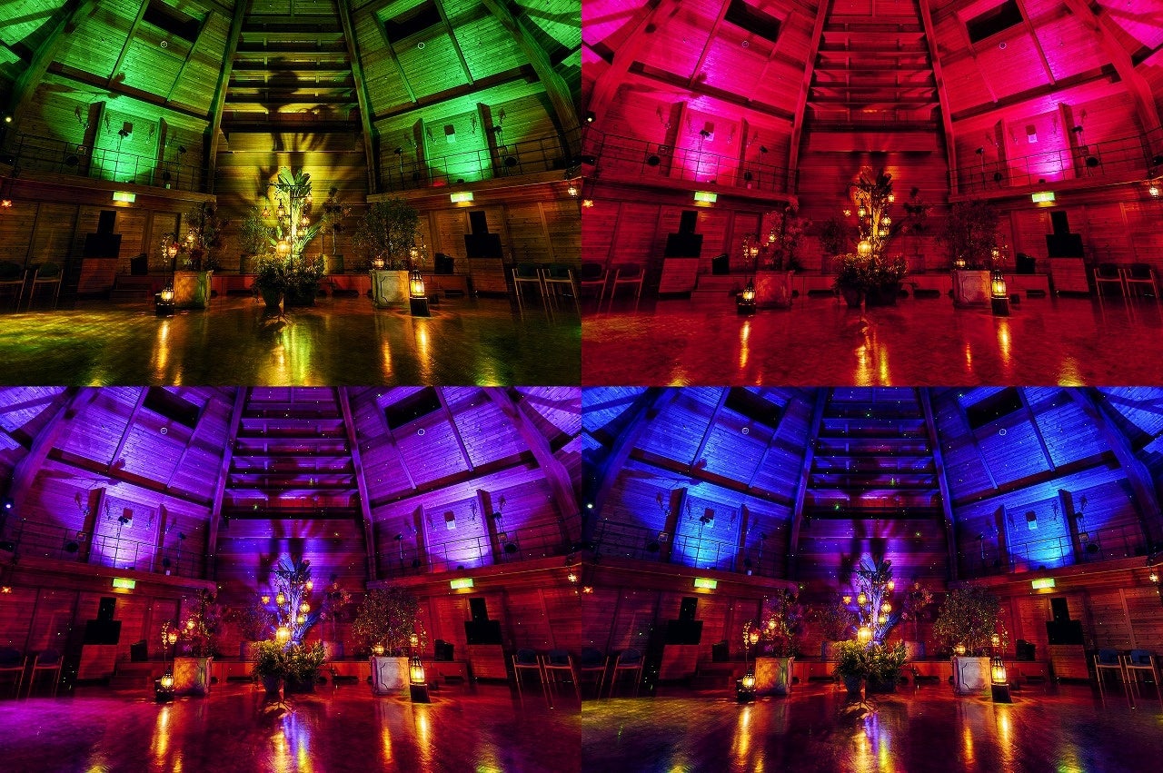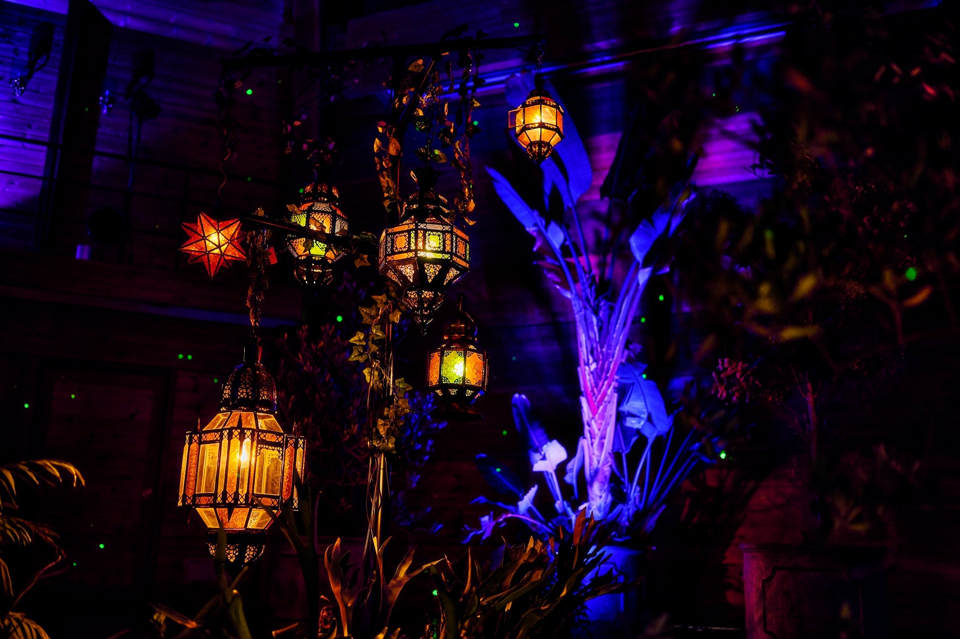 シーンに合わせ、形状やサイズの異なる約30灯のモロッコランプやゆらゆらと揺れる水面のような光、星空のような光などで樹木や植物、ホール内の色が移り変わります