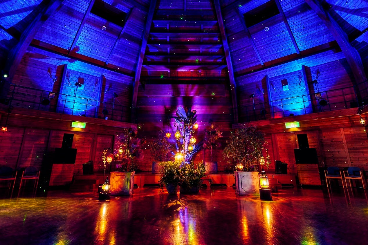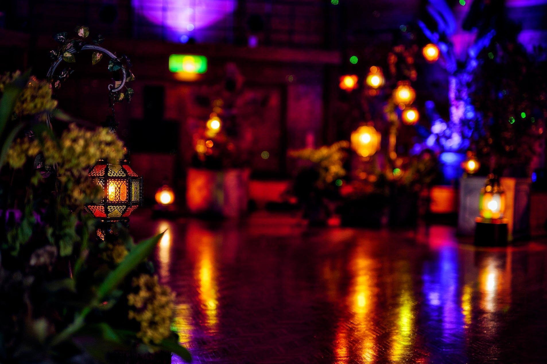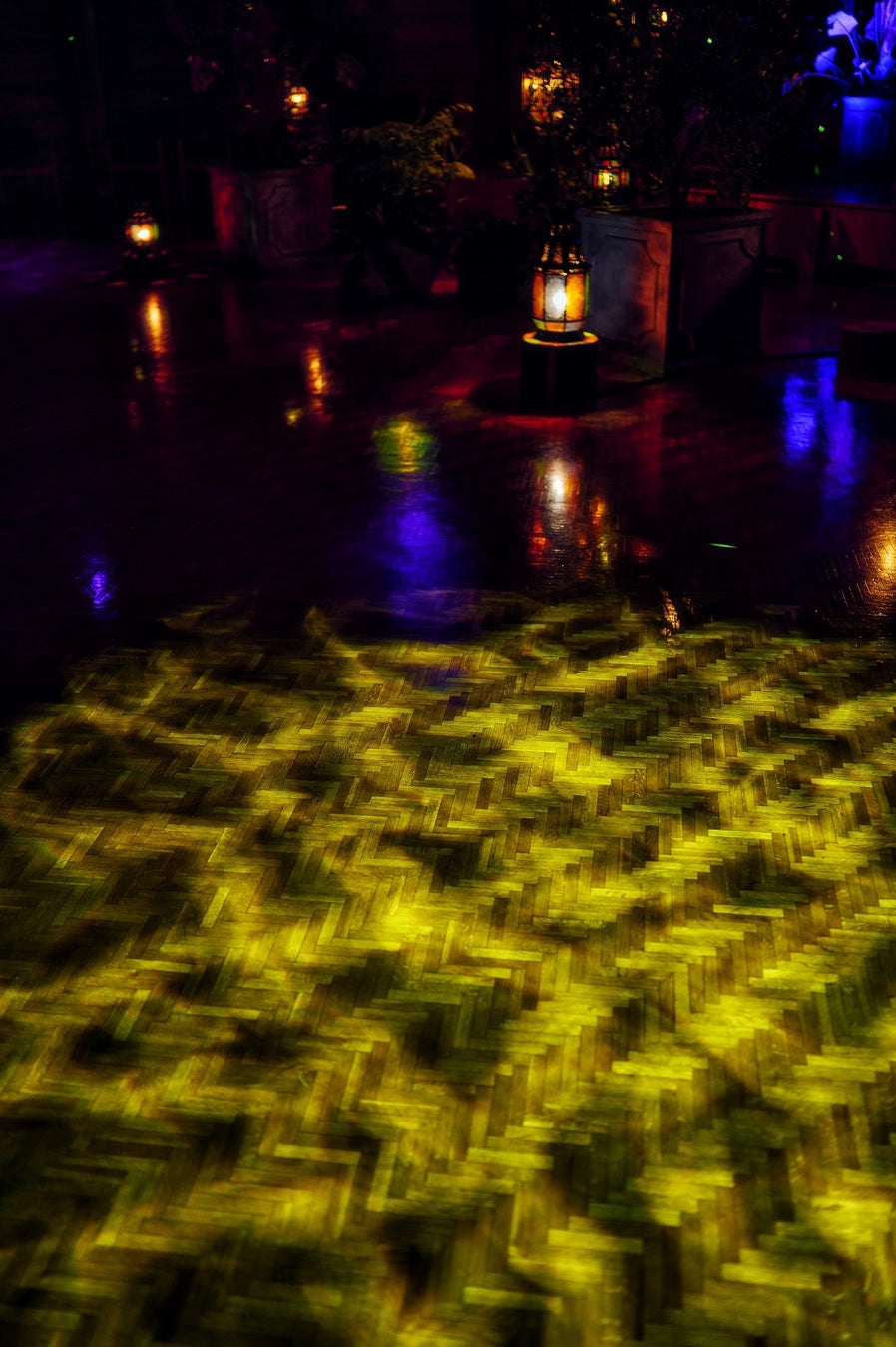 シーンに合わせ、形状やサイズの異なる約30灯のモロッコランプやゆらゆらと揺れる水面のような光、星空のような光などで樹木や植物、ホール内の色が移り変わります