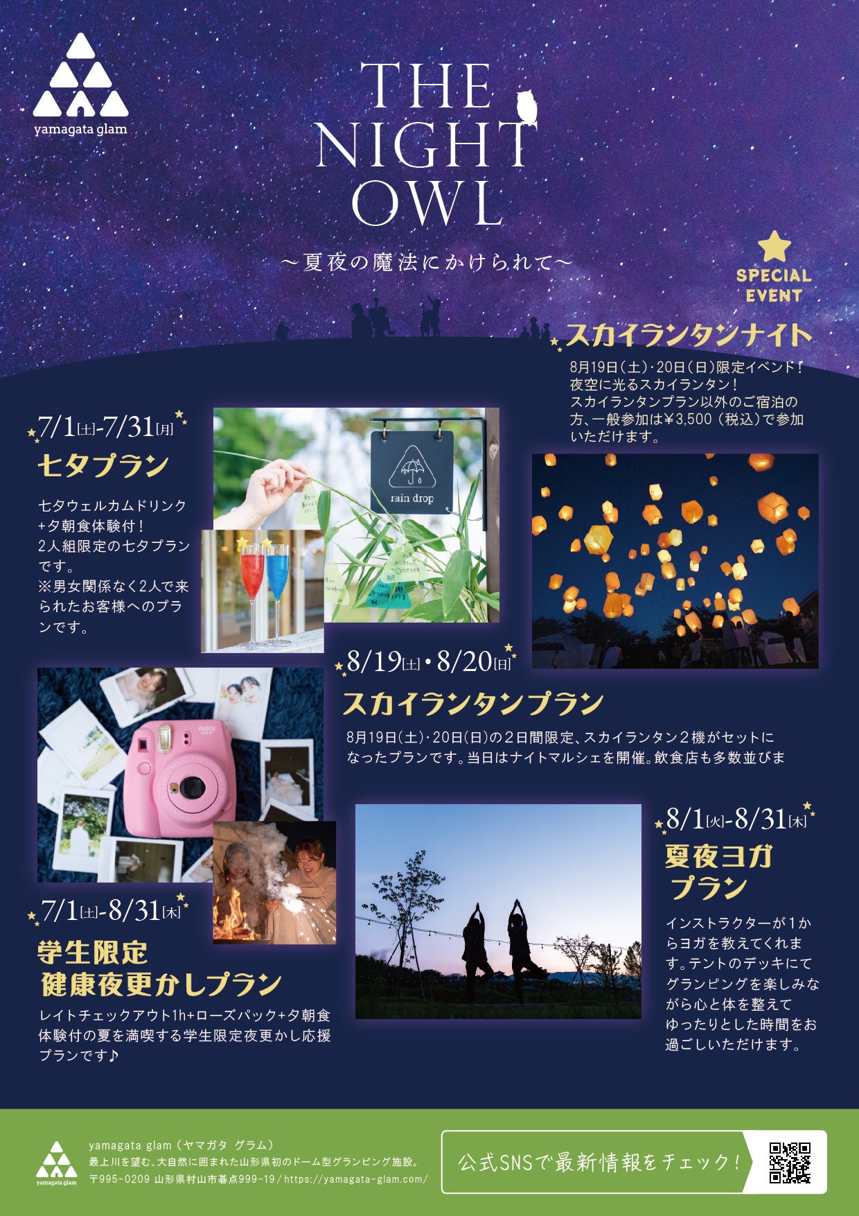 yamagata glamの夏のテーマ、「夜更かし」をテーマにした「The night owl~夏夜の魔法にかけられて~」のメイン企画として、スカイランタンナイトを開催いたします。