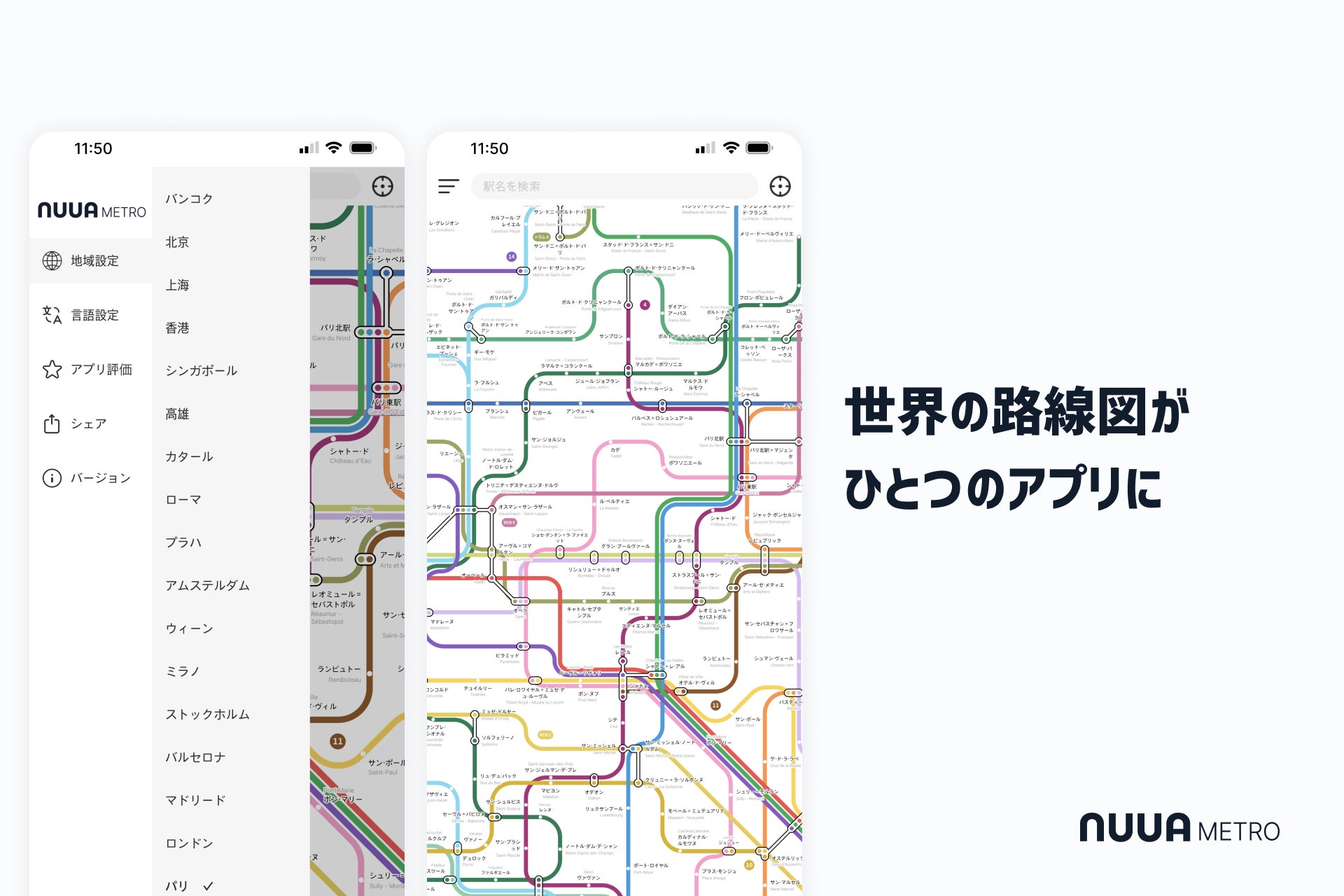 「NUUA METRO」は、アプリひとつで全16か国24エリアの路線図を見ながら乗換検索ができる、多言語・オフライン対応の乗換案内アプリです。 路線図をタップして出発・到着駅を選ぶだけで、簡単に乗換検索ができます。