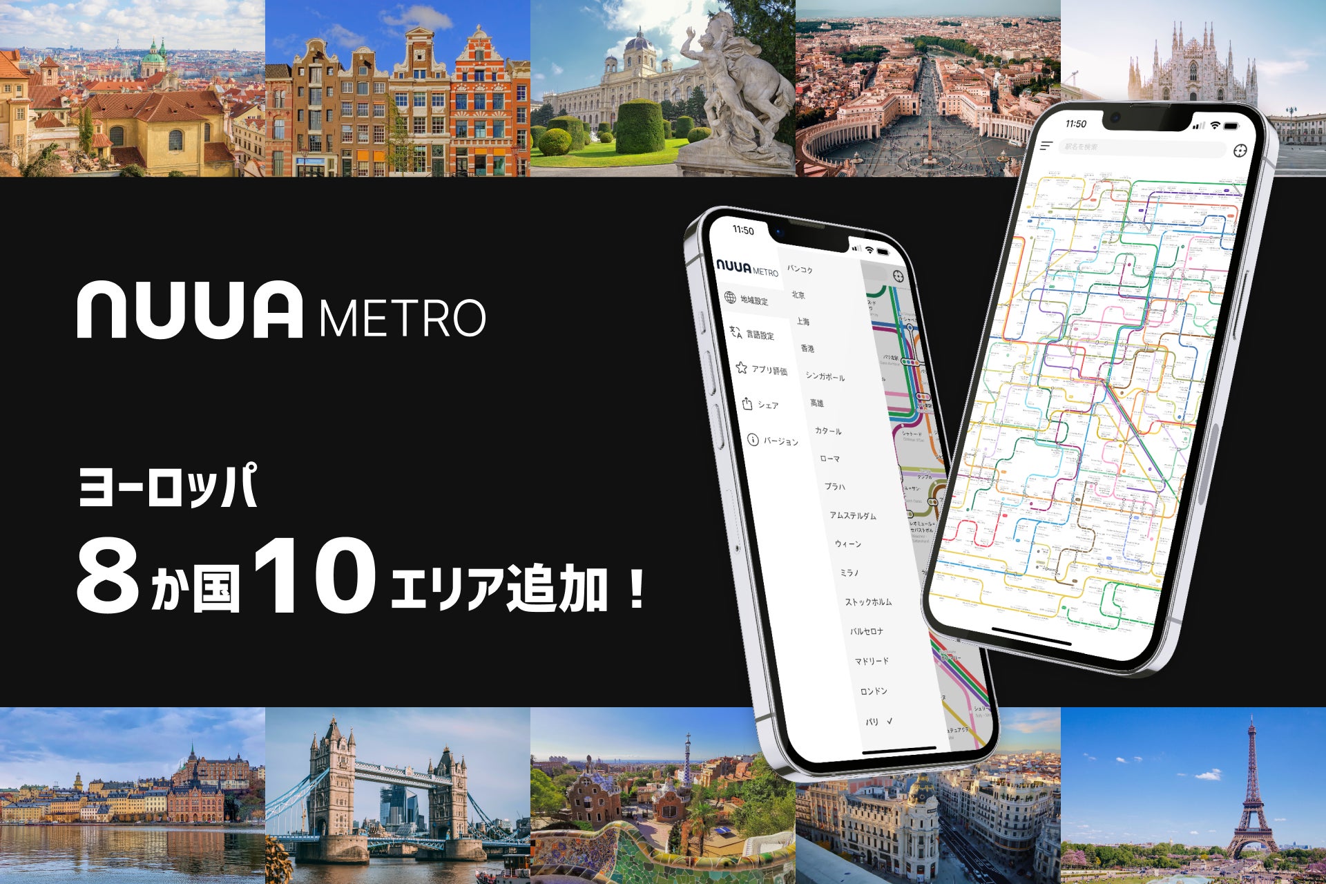 海外・国内の路線図から乗換検索ができる多言語・オフライン対応アプリ「NUUA METRO」に、ユーザーから追加リクエストを多くいただいたヨーロッパ10エリアと福岡エリアの全11エリアを追加しました。