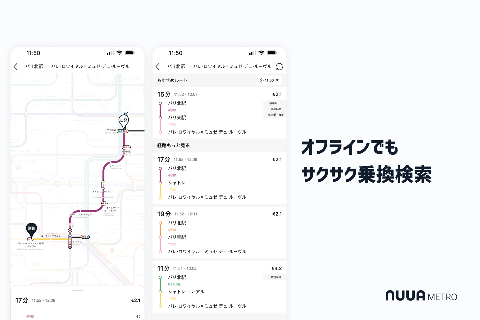 「NUUA METRO」は、アプリひとつで全16か国24エリアの路線図を見ながら乗換検索ができる、多言語・オフライン対応の乗換案内アプリです。 路線図をタップして出発・到着駅を選ぶだけで、簡単に乗換検索ができます。