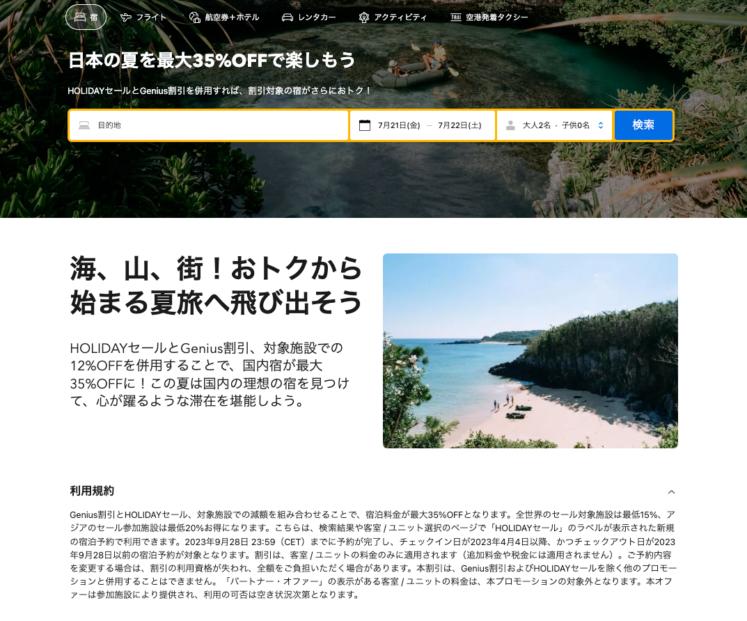 内容:​​HOLIDAYセールとGenius割引、対象施設での12%OFFを併用することで、国内宿が最大35%OFFになります。