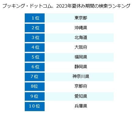日本にいる人々が2023年夏休み期間に検索された日本国内の宿泊先で、最も検索数が多いのは東京。2位は透明度の高い海が魅力の沖縄、3位は雄大な自然やグルメが豊富な北海道となりました。また、6位に静岡県、9位に愛知県と昨年よりランキングが上昇。ドラマの影響で徳川家康、所縁の地を訪れたいと考える旅行者が増えたことも要因の1つかと思います。