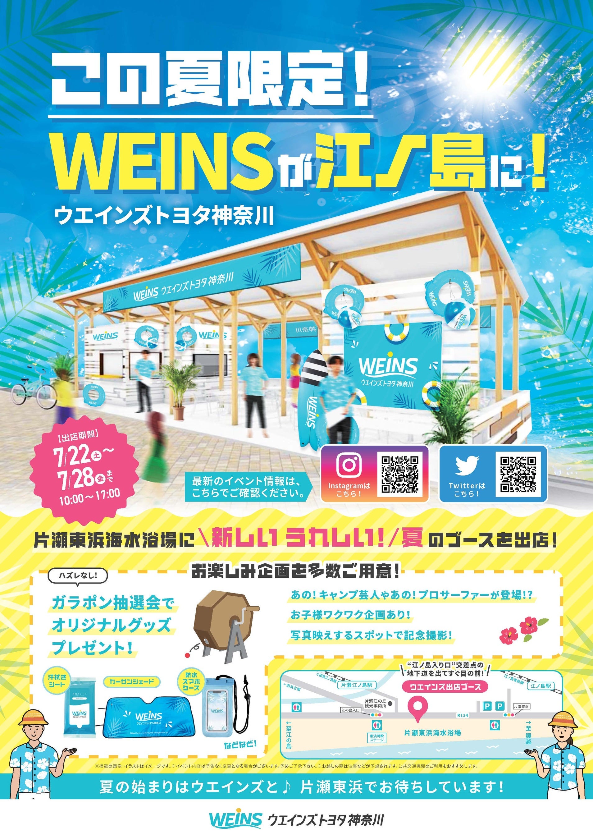 ウエインズトヨタ神奈川株式会社(本社:横浜市中区/代表取締役社長:宮原 漢二)は、地元の方々と共に地域の活性化に繋げられるよう、観光地としても有名な江の島を臨む日本屈指のリゾート海岸である片瀬東浜海水浴場に、専用ブース「ウエインズシーサイドギャラリー」を期間限定で出店いたします。