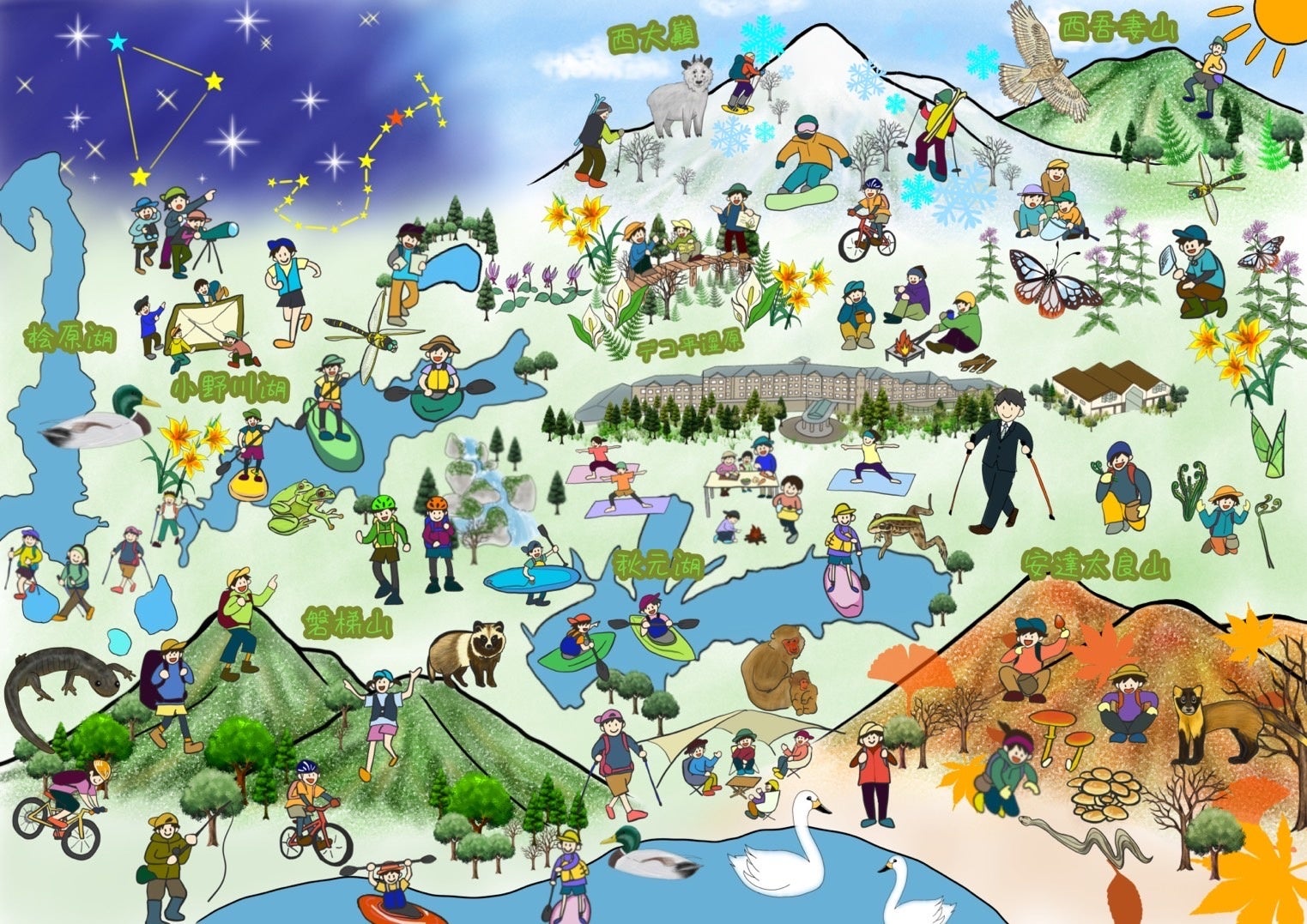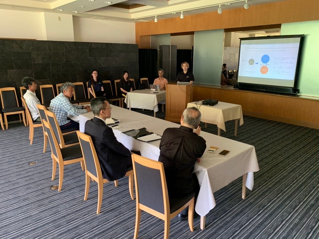 ③は、ホテルを中心とした裏磐梯エリアの、自然と共生した将来ビジョンを一枚の絵に可視化した学生作成のスライドも交えながら、当校の視点から日本の自然環境の有するポテンシャルや特徴、特に山岳国家として育まれてきた山岳信仰や神道にもまつわる日本の文化に着目し、分断の進む自然と人、都市と地域をもつなぐ役割を担うリゾートの新たなあり方や未来について提言させていただきました。