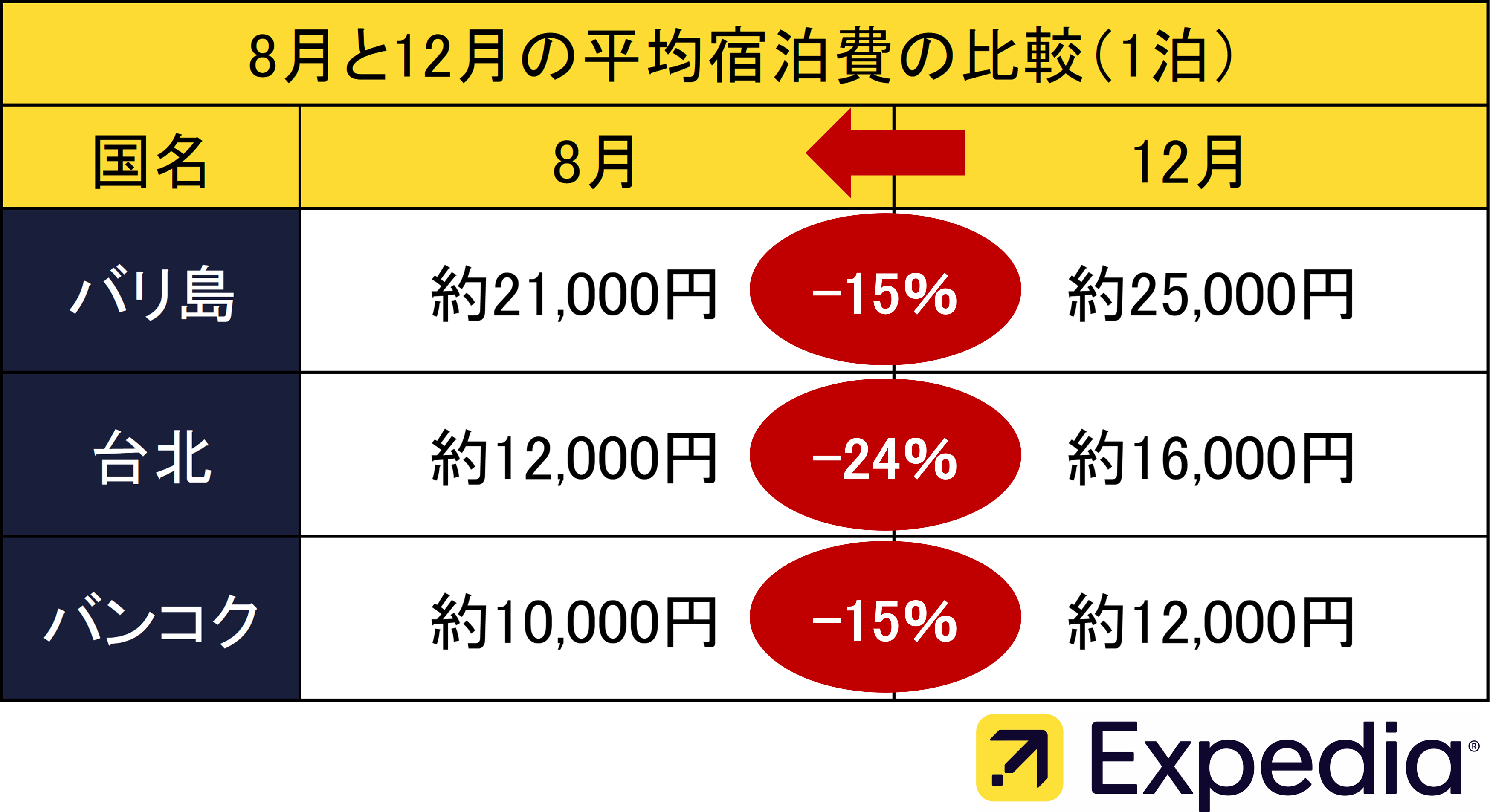 2019年8月と12月の平均宿泊費を比較してみると、「バリ島」、「台北」、「バンコク」は冬の12月よりも夏の8月の方が安く、また、その中でも「バリ島」は8月がベストシーズン。乾季にあたるため天気が良く、観光やマリンアクティビティにぴったりです。まだ夏休みの旅行を予約できていない人は、この夏「バリ島」へ行ってみませんか?