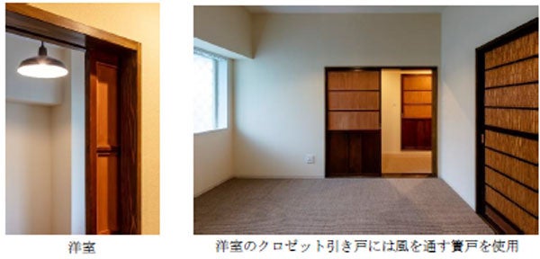 洋室のクロゼット引き戸には、「簀戸(すど)」と呼ばれている建具を使用しています。簀戸は、すだれを障子の枠にはめ込んだ建具で、昔ながらの日本家屋では6月頃障子戸を簀戸に交換し、夏に備えていました。通風性が良く、湿気のたまりやすい押し入れを快適にします。