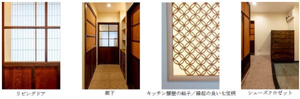 古い家屋を解体した後、捨てられてしまう古材。今回は、室内の印象を左右する「建具」に古材を取り入れました。リビングドア・トイレドア・廊下収納の扉・洋室のクロゼット引き戸・キッチン腰壁の組子は谷中・千駄木付近で引き取られ、ヤマムラで保管されていたものです。広縁の5枚障子戸・洋室ドア・洗面室ドアはすみだ向島地域の古民家で使われていたもので、古材レスキュー(引き取り)等、古民家を残す活動をされている後藤大輝様(※)にお譲りいただきました。また、シューズクロゼットは、タンスをリメイクし、靴箱として再利用しています。