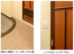 建物再生に数多く取り組まれているヤマムラの協力により、空間の印象を左右する建具を中心に古材を活用し、壁紙やスイッチパネル・照明にレトロな雰囲気を取り入れて仕上げました。