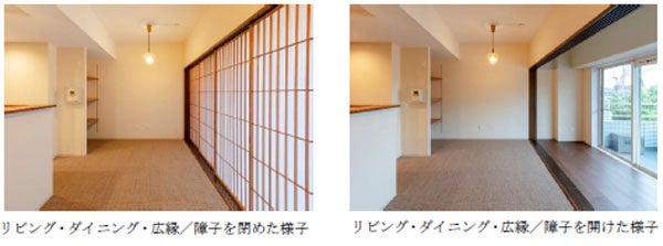 ただレトロな雰囲気にするだけではなく、ライフスタイルも“レトロ”にとの思いから、バルコニー側に「広縁(奥行きが120cm以上の縁側)」をつくりました。ここに椅子とテーブルを置いてお茶を飲んだり、読書をしたり、寝転んで昼寝をしたり、住まう人のライフスタイルにあった新しいすごしかたができるスペースです。障子には光を拡散させ、部屋全体を明るくする機能があるため、障子を引けば夏の厳しい日差しや西日もやわらぎ、陽ざしを楽しむことができます。