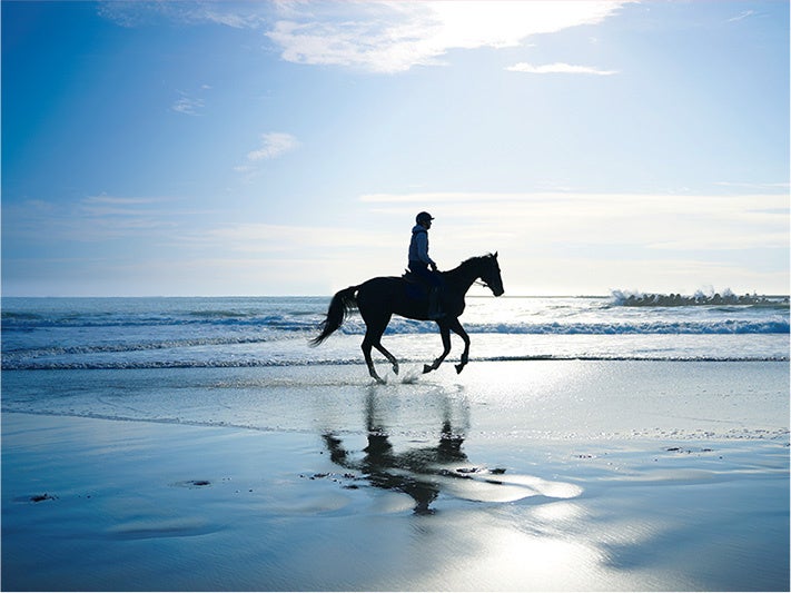 お祭りの時期には町中を馬が散歩するほど馬の文化が根付いています。馬が身近なこの町では、太平洋を眺めながらのビーチホースライディングや、広い森の中でのトレッキングが可能。お仕事のスキマ時間に南相馬市小高区の町中を馬に乗って散歩する小高うまさんぽなども他所ではできない経験です。