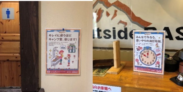 洗い場などの施設や焚火でのマナーやゴミの分別についてなどキャンプ場に直接設置できるPOPを制作して、賛同いただいたキャンプ場に配布しています。