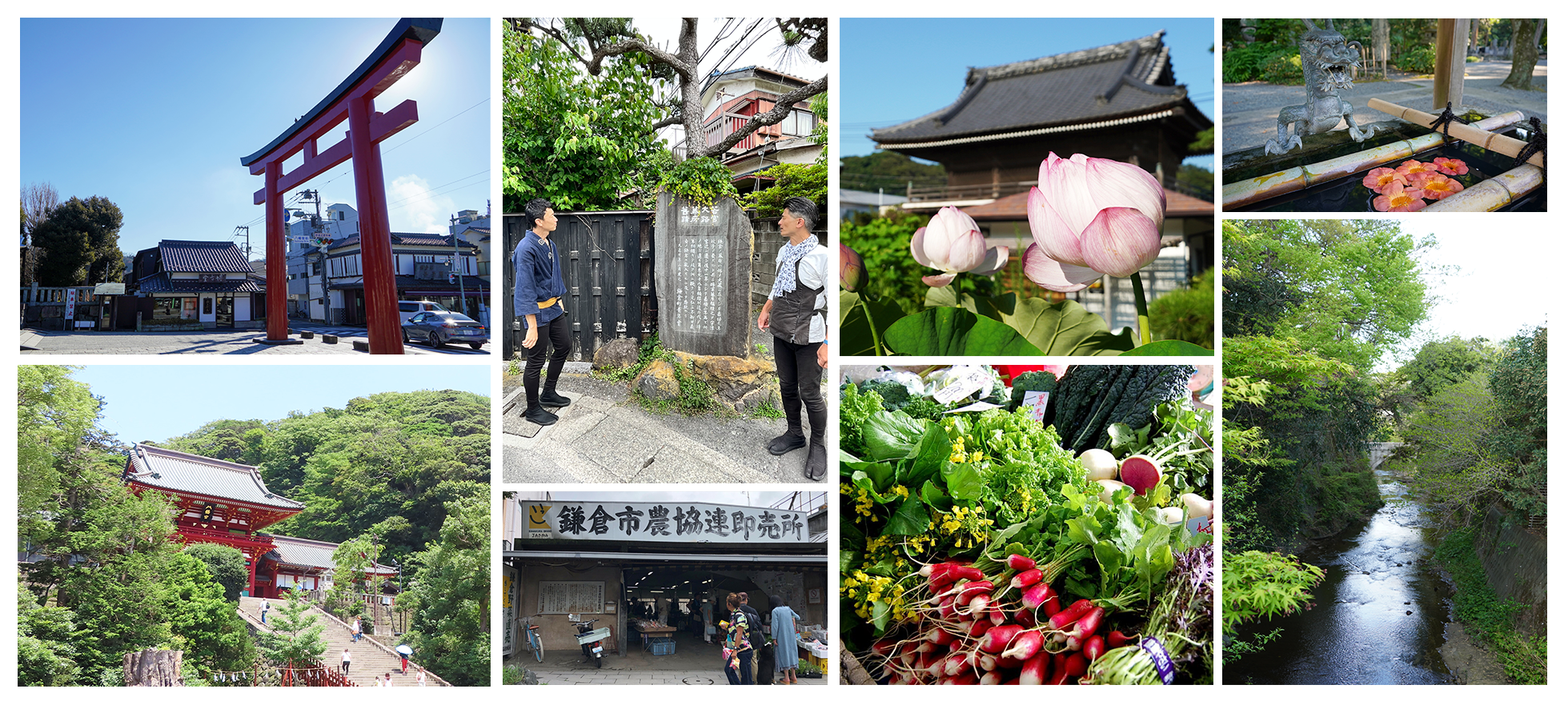鶴岡八幡宮や本覚寺、妙本寺などのホテル近隣の寺社や、小町大路などの裏路地を、普段は人力車を曳きながら話す鎌倉の魅力や各スポットのうんちくなどをお客さまと共に歩いてご案内します。最後はレンバイ(鎌倉農協連即売場)で解散となりますので、新鮮な鎌倉野菜や朝ごはん巡りもお楽しみいただけます。
