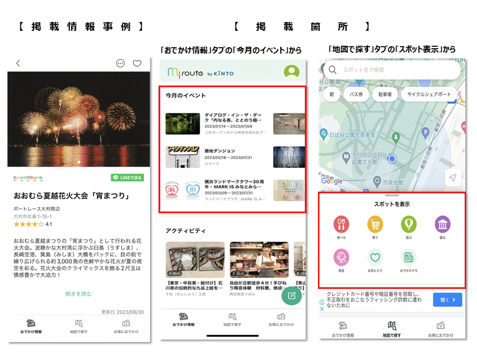 お客様の現在位置から30㎞圏内の旬のイベント情報を掲載。全国2万団体を超える主催者が発信する年間約4万件のお祭り、花火大会、展覧会、フードイベント、お客様参加型イベントなど多彩なイベントが見つかります。my routeの「おでかけ情報」画面の「今月のイベント」から、お近くの今開催しているイベントが閲覧可能。また、「地図で探す」画面では、スポット表示タブの「遊ぶ」「観る」のボタンを押すことで、地図上に現在地点近くのイベント情報が表示されます。