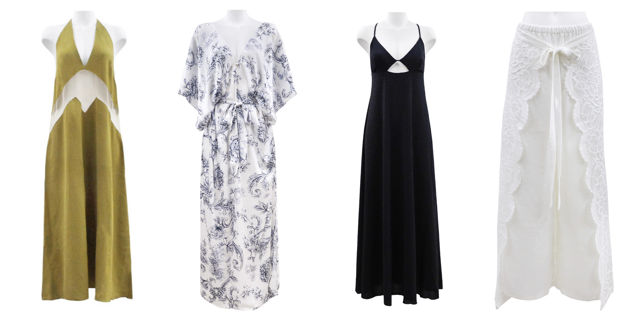左から:①シアーリゾートドレス¥14,300- / ②Divaトワルドジュイプリントローブ¥12,980- / ③Bkackバックデザインリゾートドレス¥13,200-/④Iconicレーススリットリゾートパンツ¥10,780-