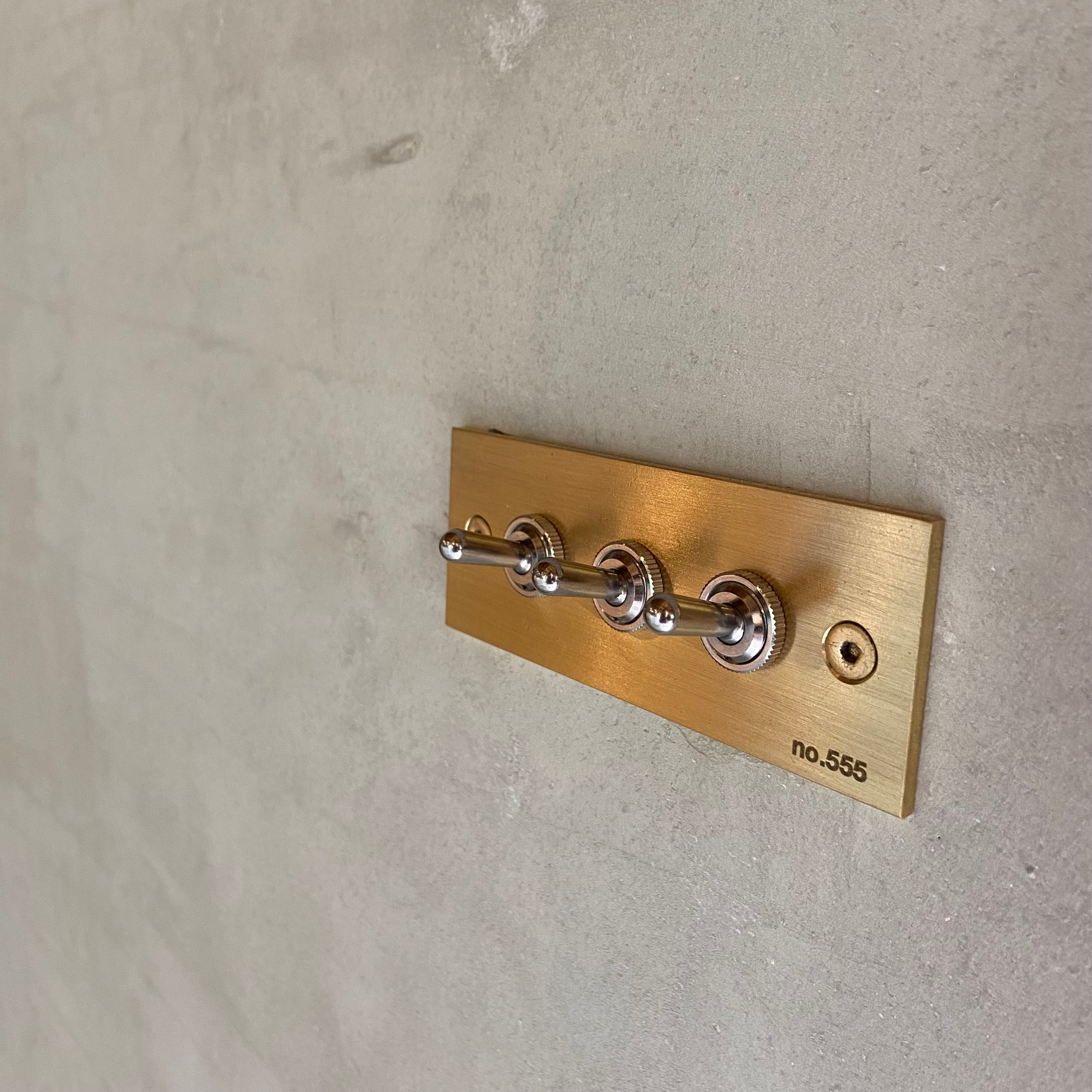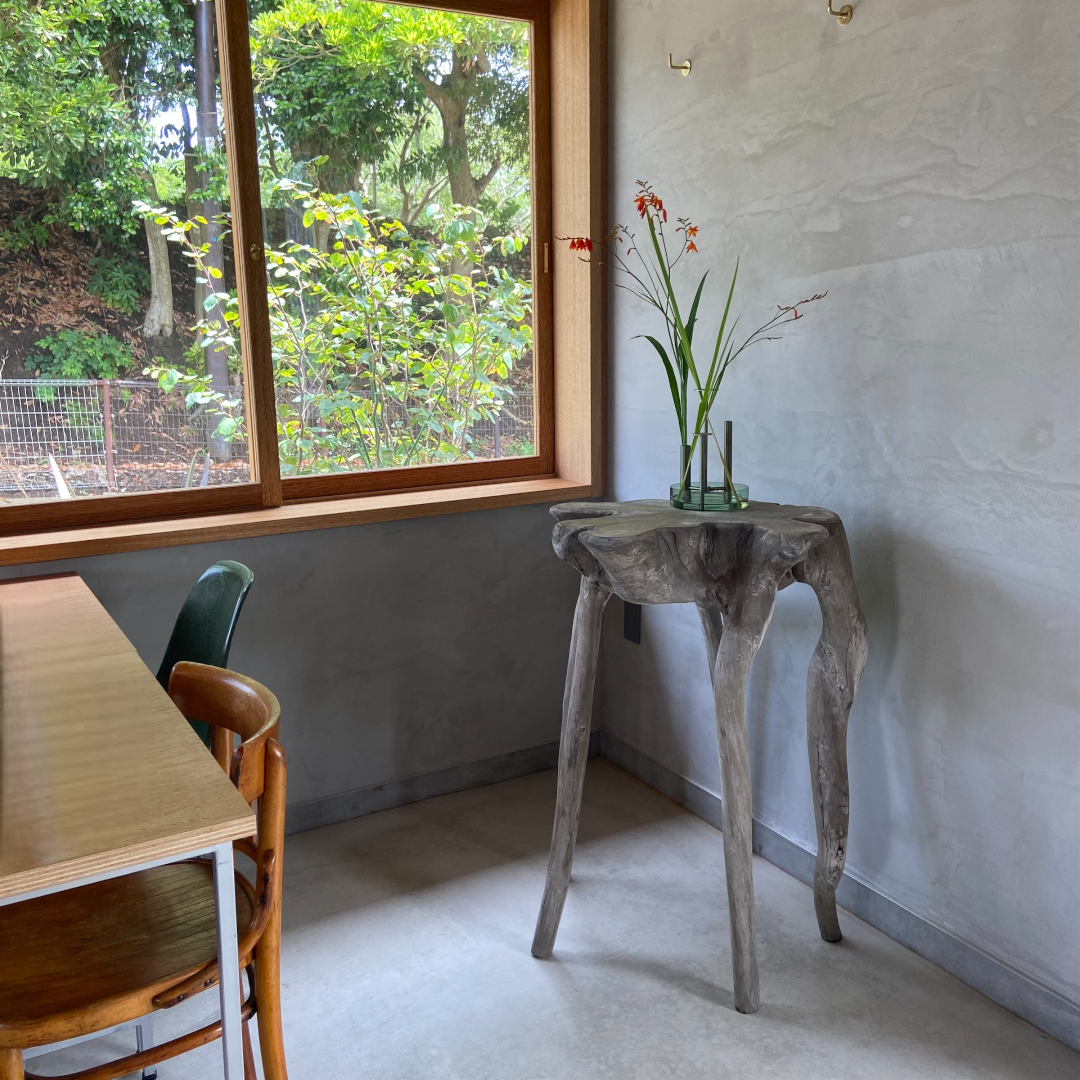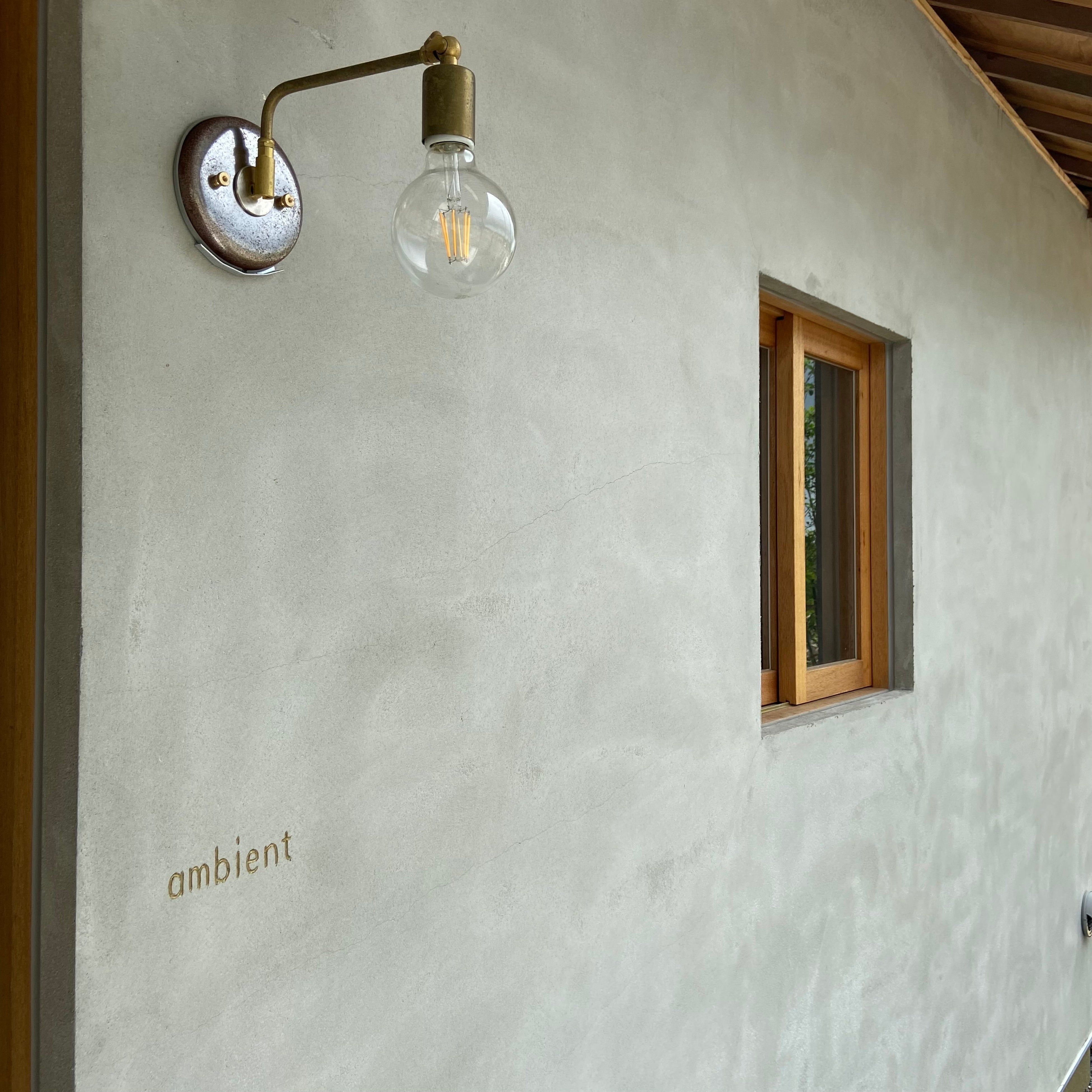 モルタルの壁には真鍮を散りばめ、古道具インテリアをレイアウト。