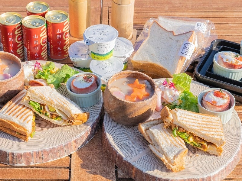 映え必見!山形の旬の食材を使用した朝食メニュー。ホットサンドなど、人気のキャンプ飯をお楽しみいただけます。