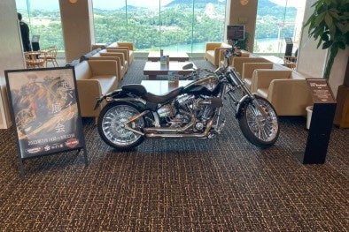 ゆずり葉ロビーにて、愛知県を中心にオートバイ専門店を展開する株式会社チャンピオン76様のご協力で、ハーレーダビッドソン、BMW、MUTTの3台の大型バイクを展示致します。イベント期間中は、ロビーの窓辺一面に広がる恵那峡の美しい景観を背景に記念写真を撮影することができます。
