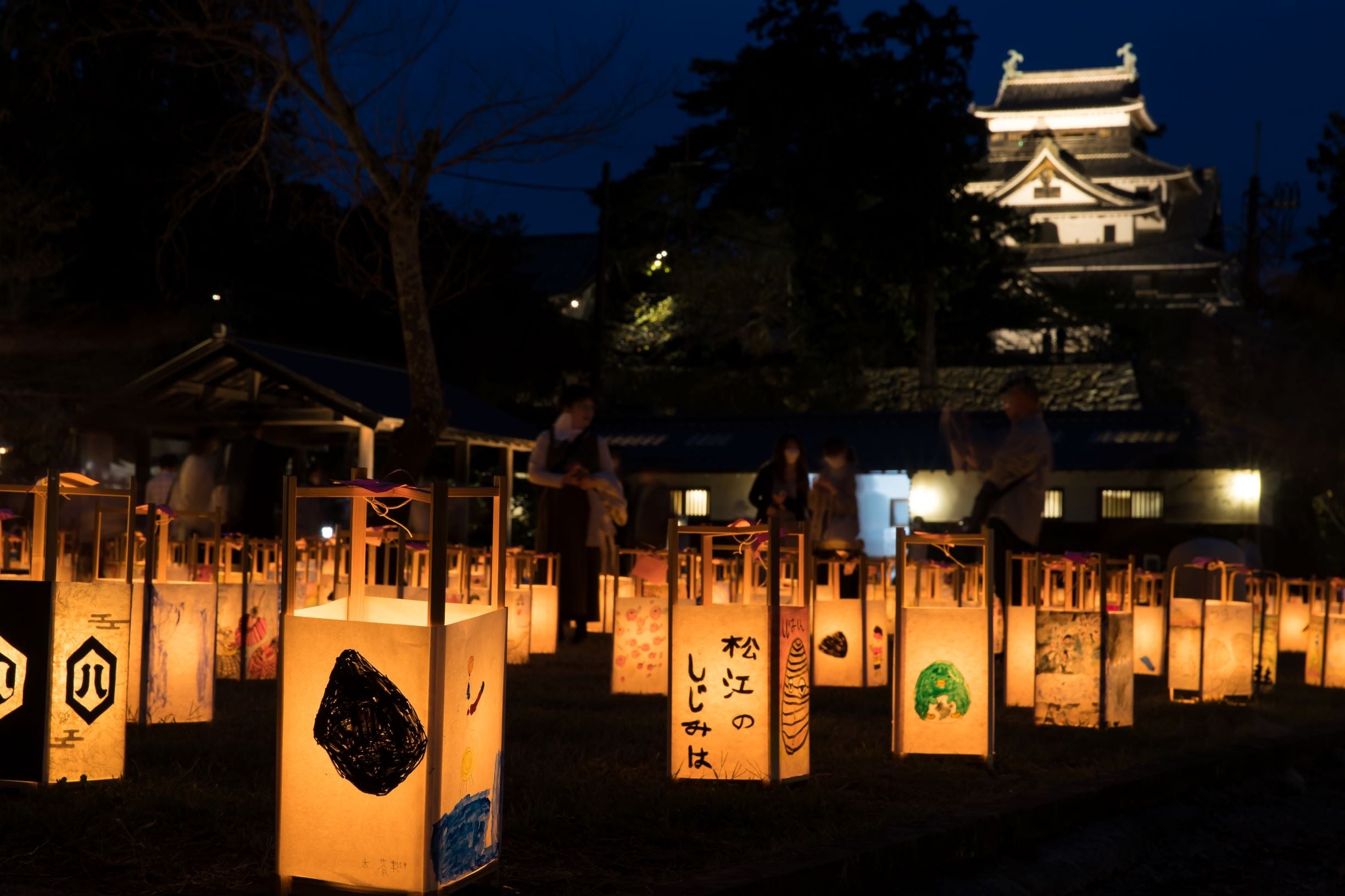 松江水燈路は、松江ライトアップキャラバン実行委員会が主催する、松江城周辺を多くの行燈によりライトアップする光のイベントで、城下町松江ならではの光と影が織りなす風景を楽しむことができます。
