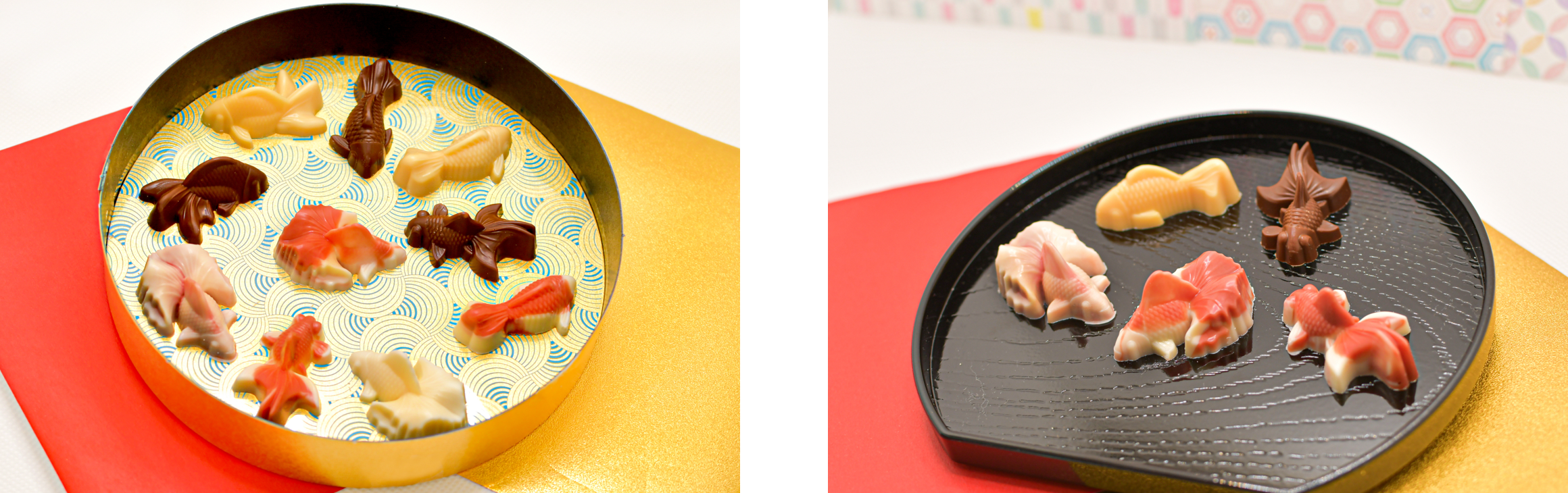 ゆらりと水面に波紋を広げながら、優雅に泳ぐとりどりの金魚たち。いちごやパッションフルーツのチョコレートに加え、カカオ豆の選別、焙煎から手がける自家製ビターミルクチョコレートを使用し、華やかなアクアリウムを表現しました。