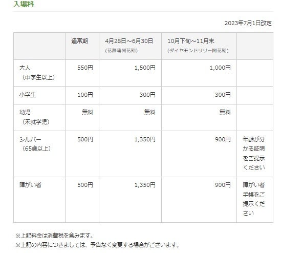 ※ダイヤモンドリリー開花期(10月下旬~)は、大人+400円、小学生+200円
