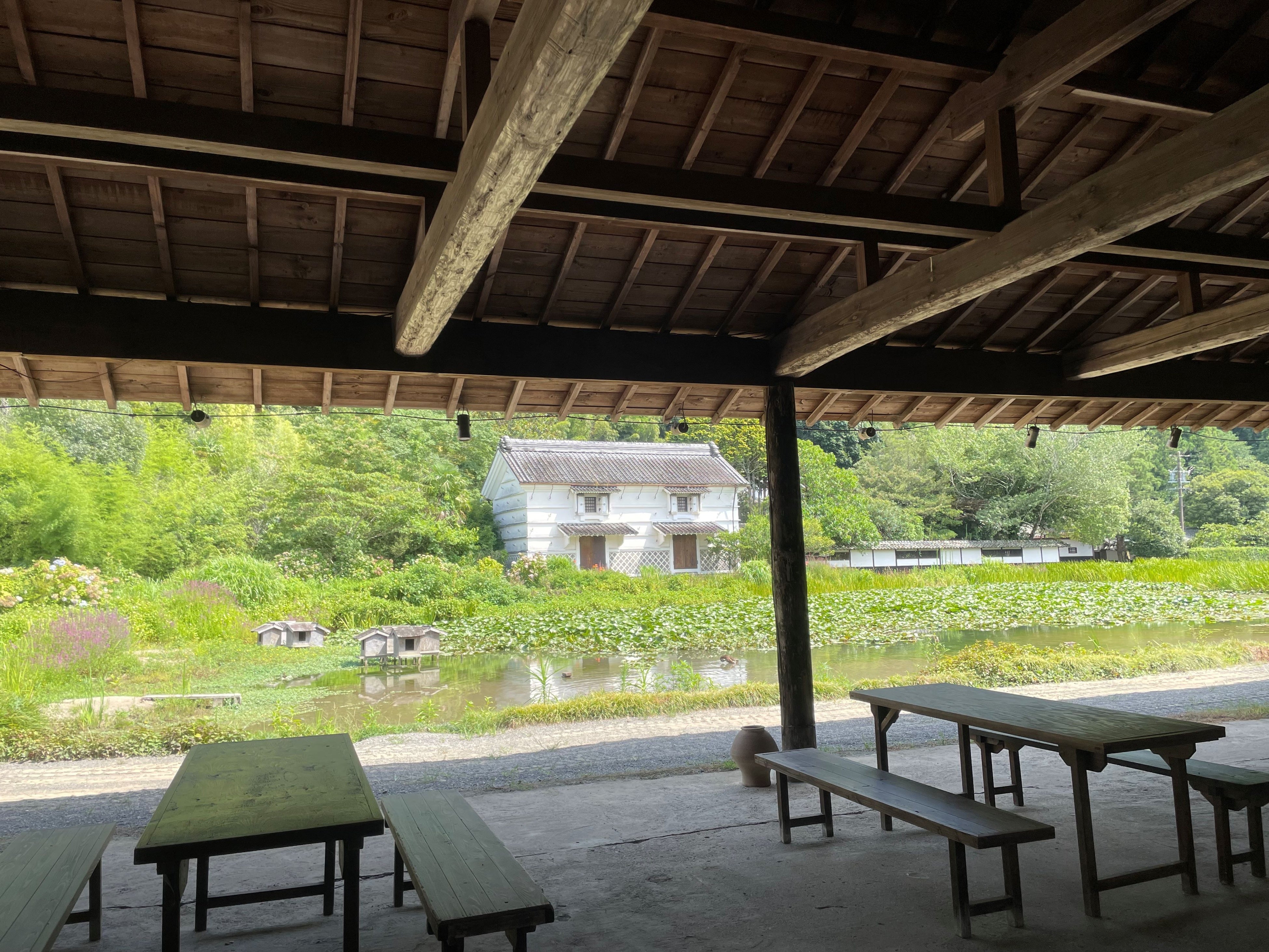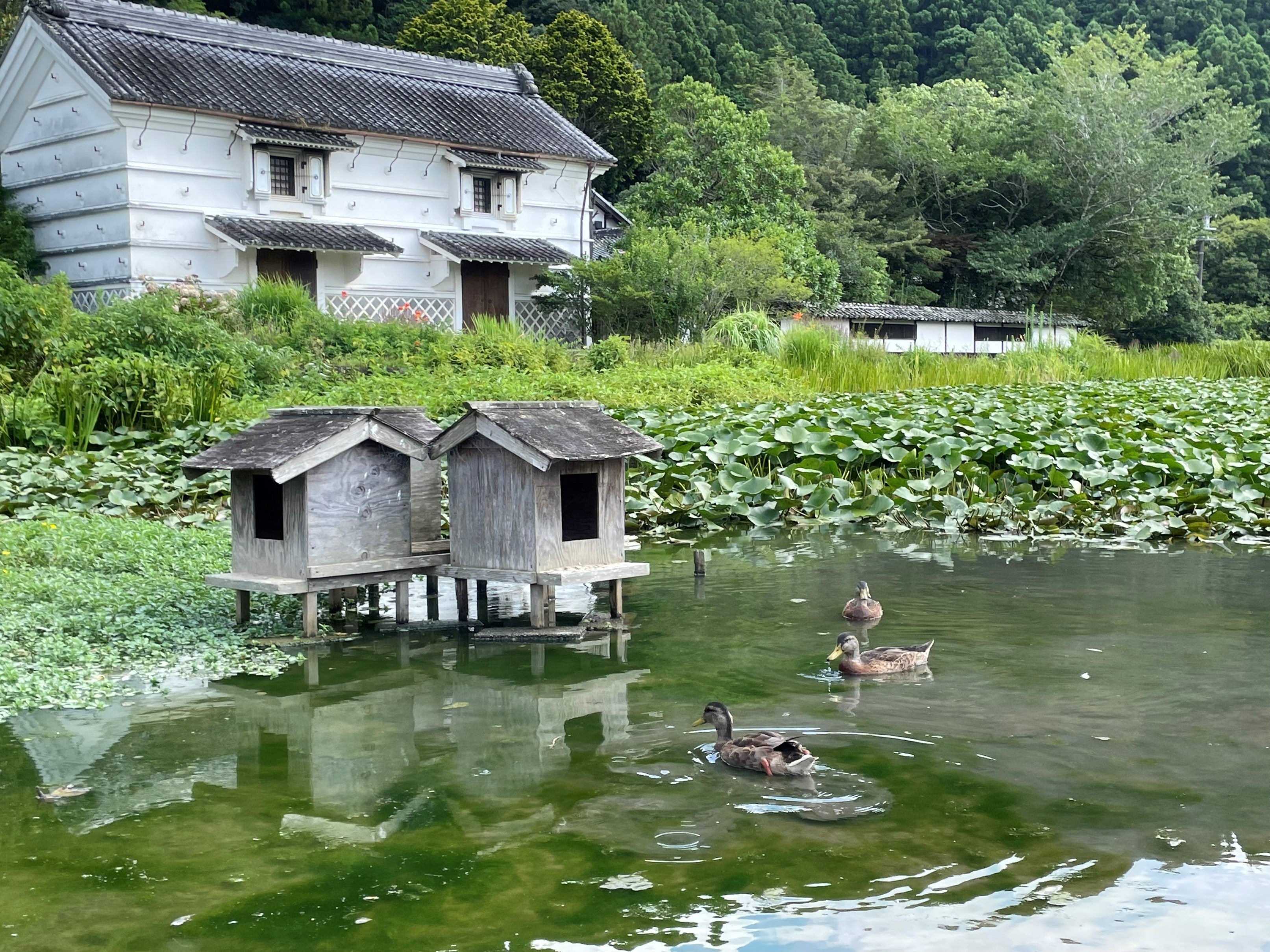 加茂荘は深い森に囲まれた山を背景に、目の前にはカモの泳ぐ池や白壁造りの趣ある蔵があり、