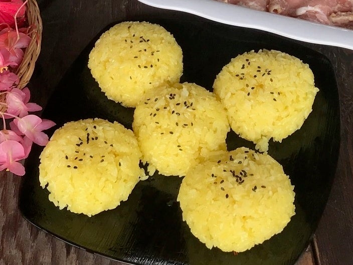 染めたおこわのこと。BBQをしながら、古き良き時代の食も楽しめる。