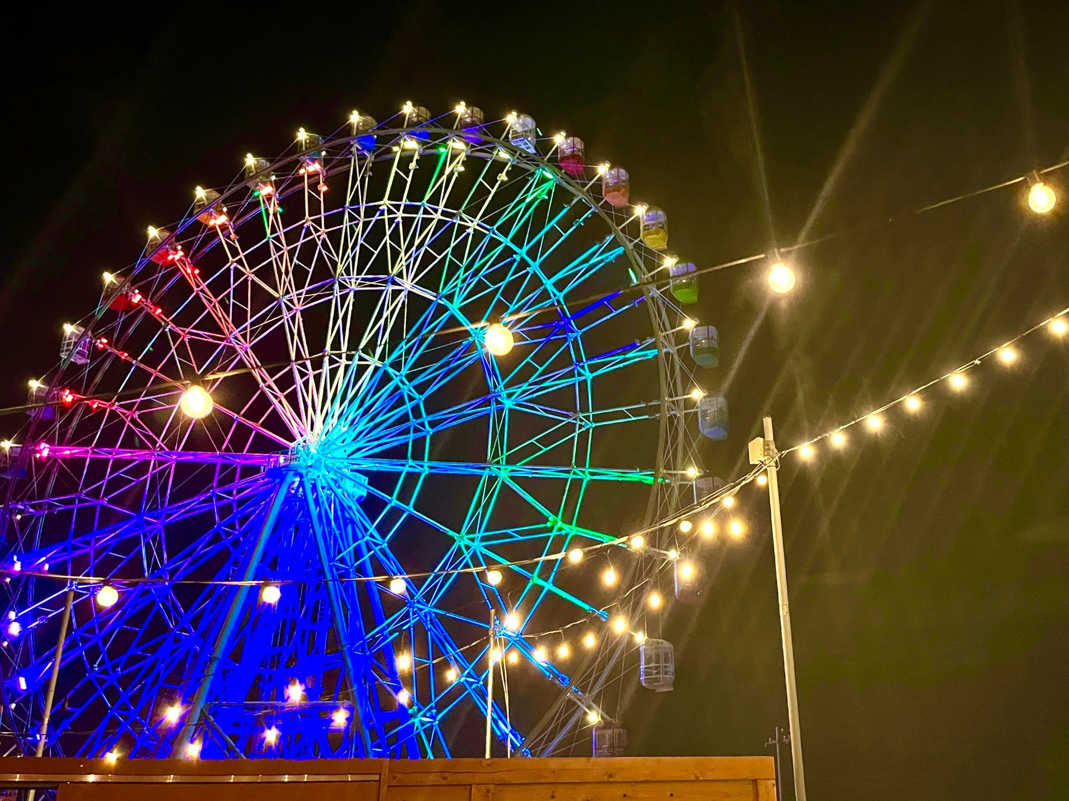 観覧車のイルミネーションと淡いあたたかな灯りの電飾が幻想的なガーデンテラスで