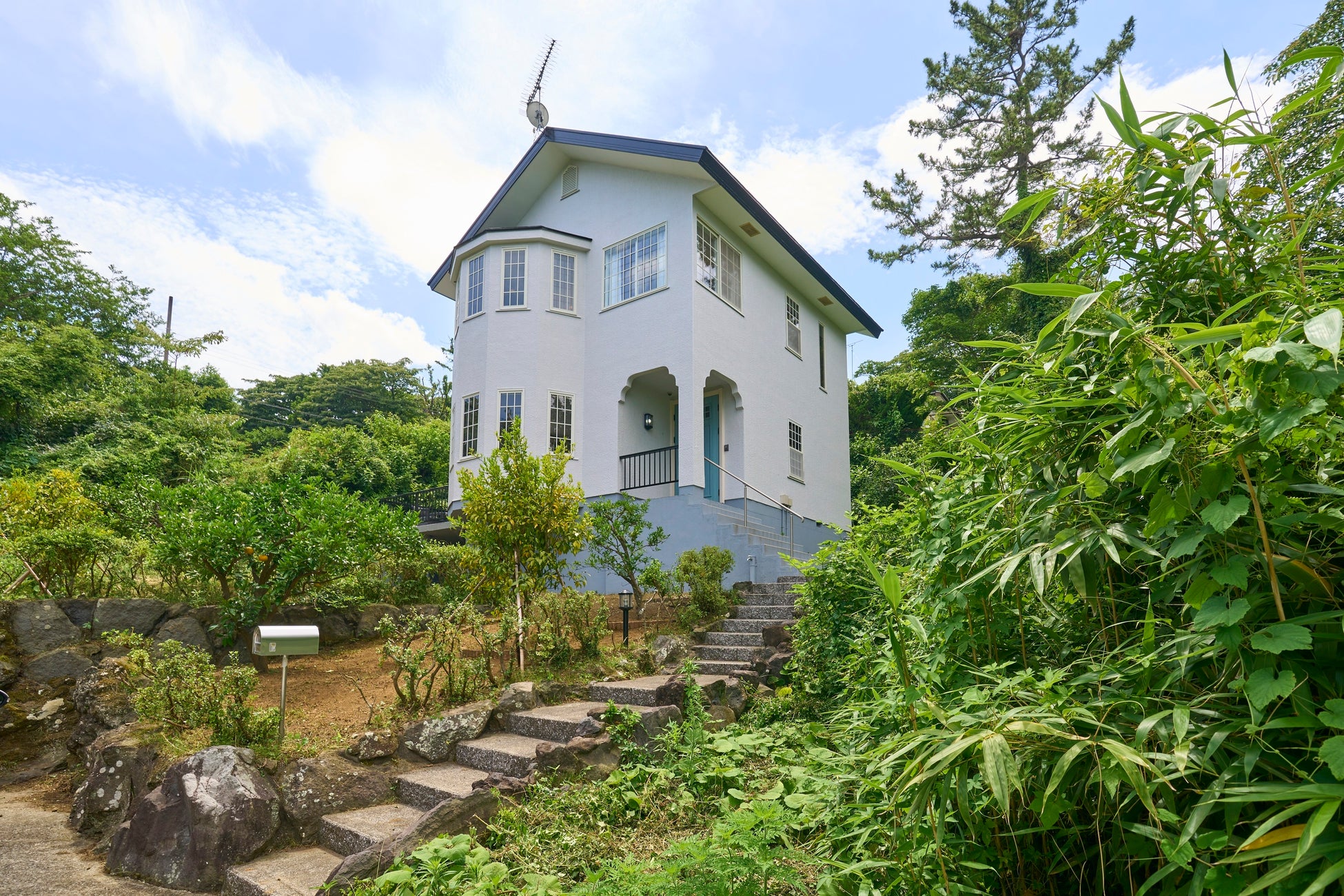 「スイートヴィラ 伊豆高原 みかんの花咲く白い家」は、その名の通り真っ白な外観が特徴的な一戸建てタイプの貸別荘で、初夏にかけては庭に咲くみかんの花が別荘滞在に華やかな彩りと香りを添えます。広い窓からは庭のみかんの木々、遠くに望む海が広がっており、伊豆の風景をイメージした歌詞で知られる童謡“みかんの花咲く丘”の中で唄われる風景そのものです。豊かな緑が迫るなか、朝は小鳥のさえずりで目が覚め、ときにリスが窓辺に遊びに来るなど伊豆の自然に寄り添う滞在を楽しめます。