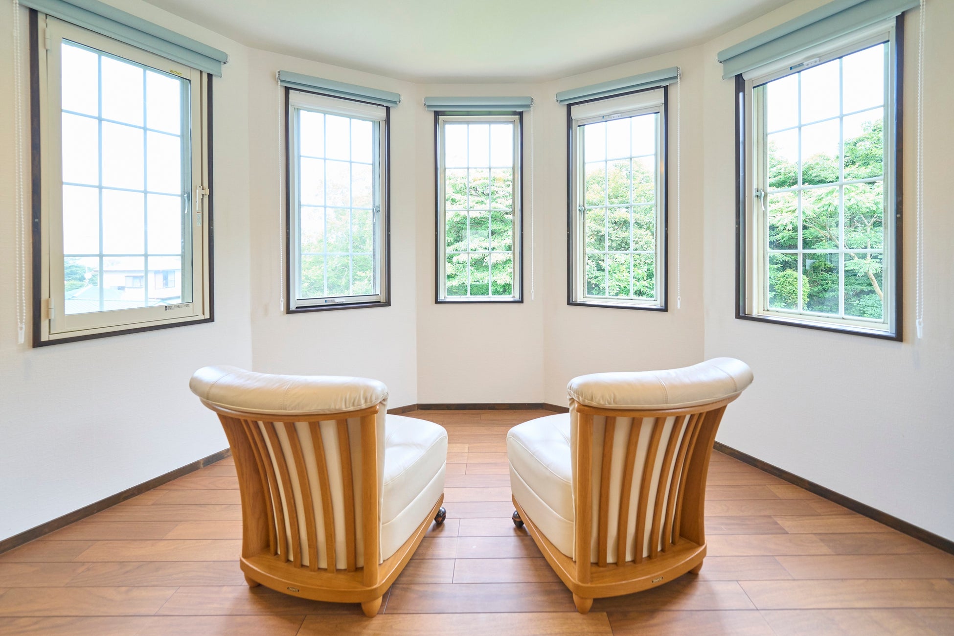 2階建ての3LDKの全面リフォームが施された室内は、白を基調にした内装の洗練されたデザインで清潔感が漂います。寝室は1階に2室の洋室(シングル×2、ダブル×2)、2階に和室(布団×3)があり、最大9名様までご利用いただけます。広々としたリビング・ダイニングスペースには、白い電子ピアノ、ソファ、ダイニングテーブルを備えており、円形状におしゃれに取り付けられた複数の窓が、ご家族・ご友人との団欒のひと時を楽しく演出します。また、屋外に設置されたテラススペースでは伊豆高原の自然を感じながらゆったりとお過ごしいただけます。