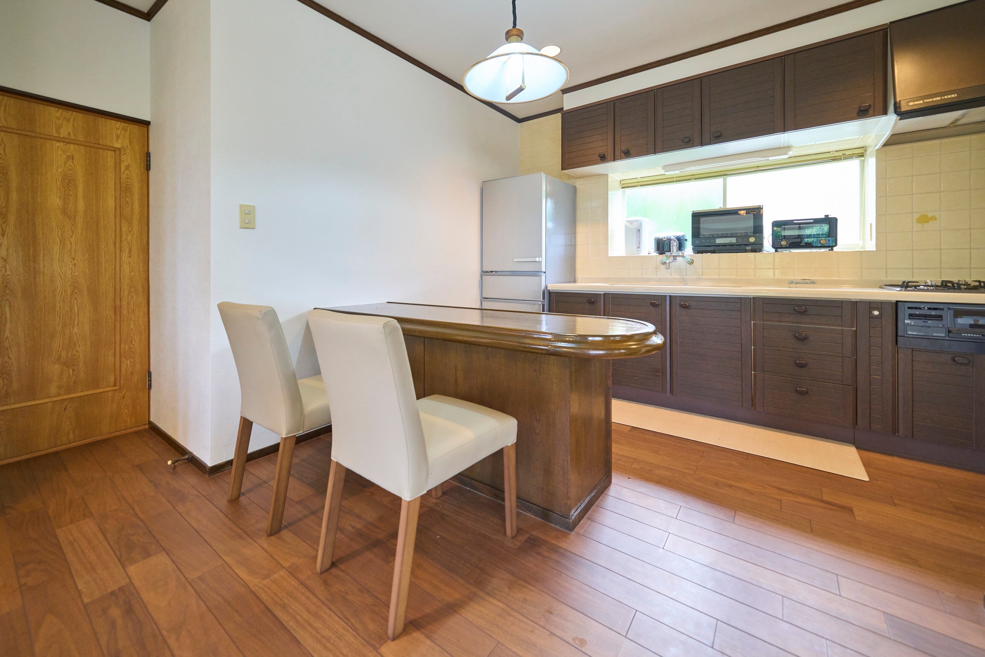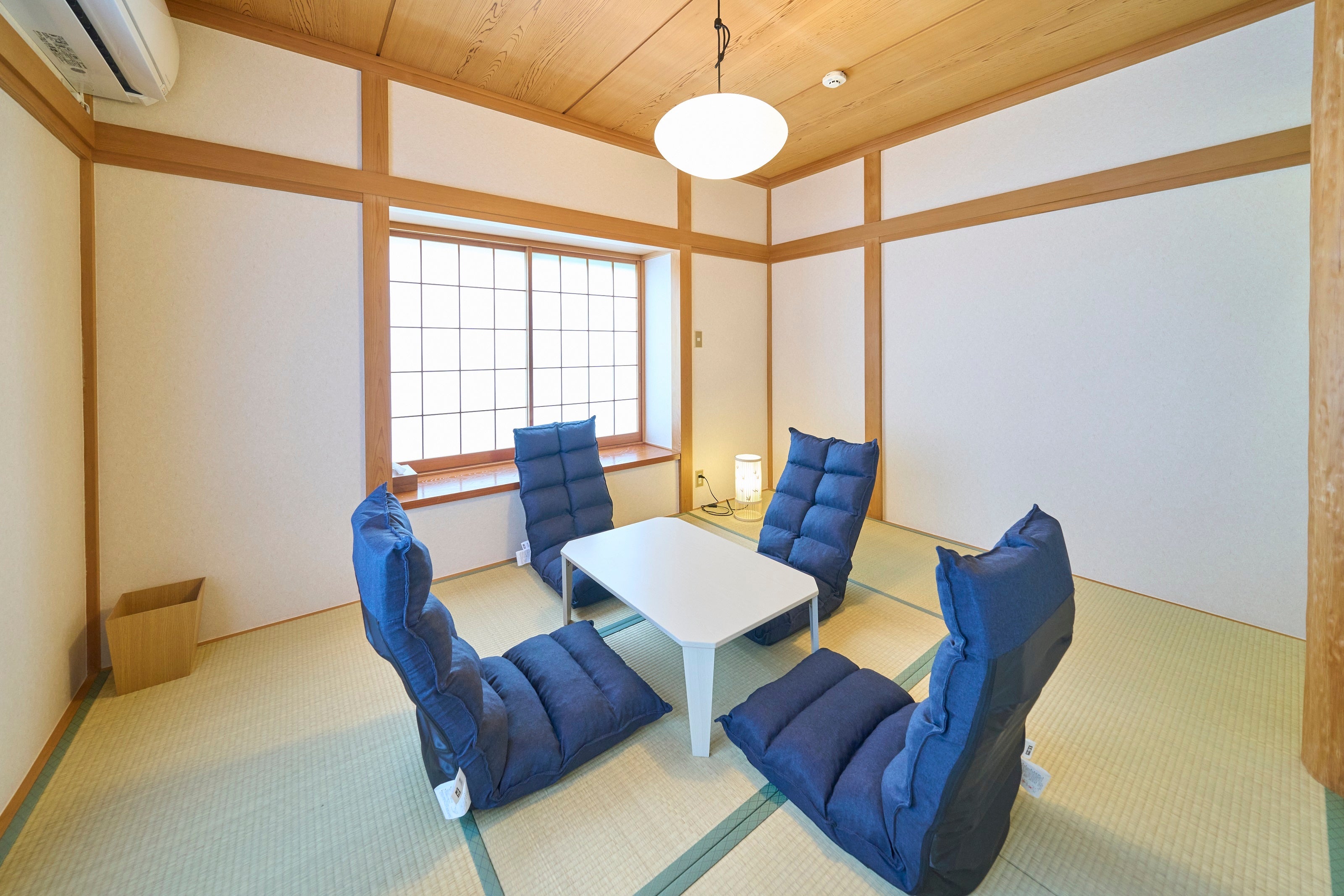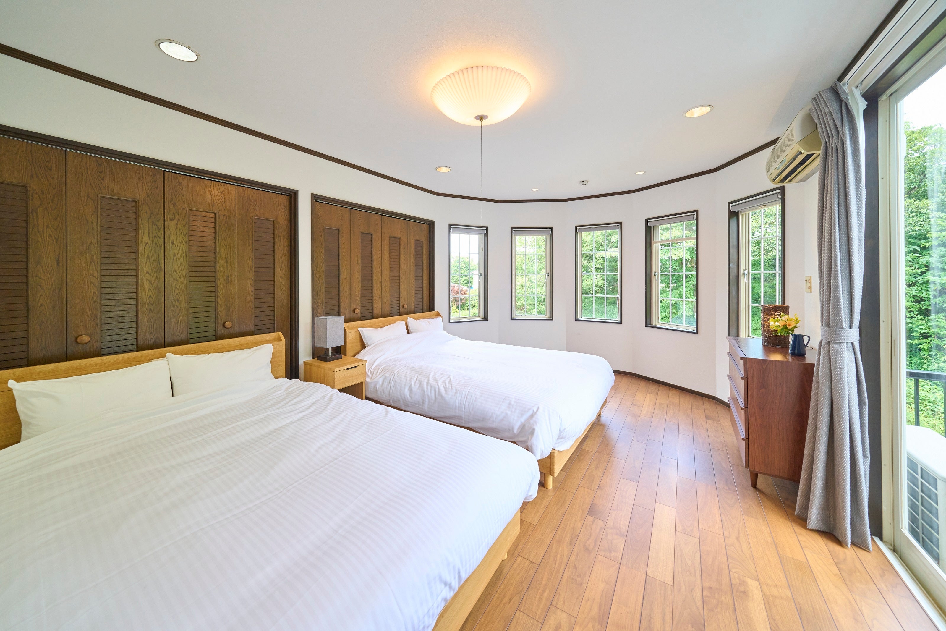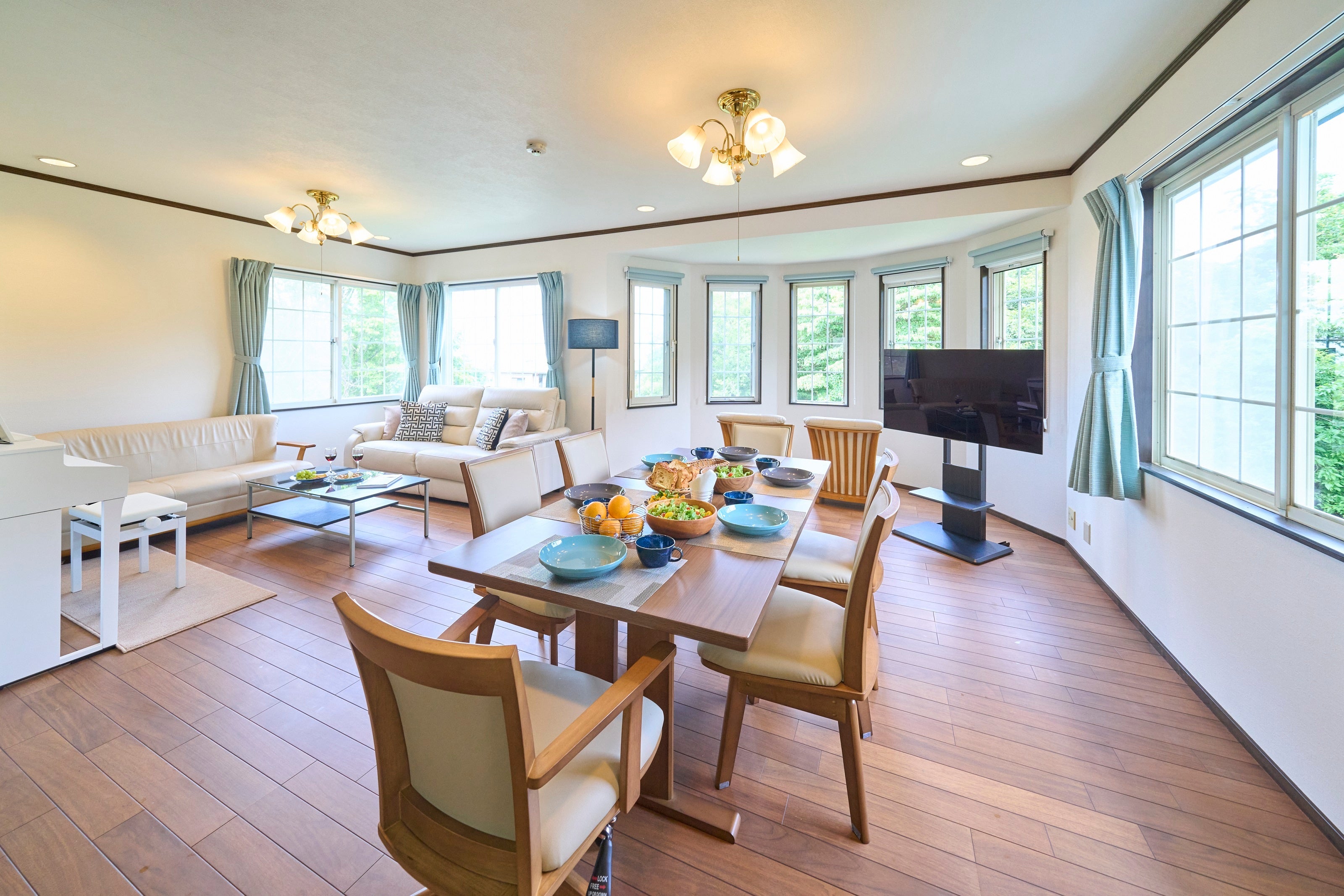 2階建ての3LDKの全面リフォームが施された室内は、白を基調にした内装の洗練されたデザインで清潔感が漂います。寝室は1階に2室の洋室(シングル×2、ダブル×2)、2階に和室(布団×3)があり、最大9名様までご利用いただけます。広々としたリビング・ダイニングスペースには、白い電子ピアノ、ソファ、ダイニングテーブルを備えており、円形状におしゃれに取り付けられた複数の窓が、ご家族・ご友人との団欒のひと時を楽しく演出します。また、屋外に設置されたテラススペースでは伊豆高原の自然を感じながらゆったりとお過ごしいただけます。