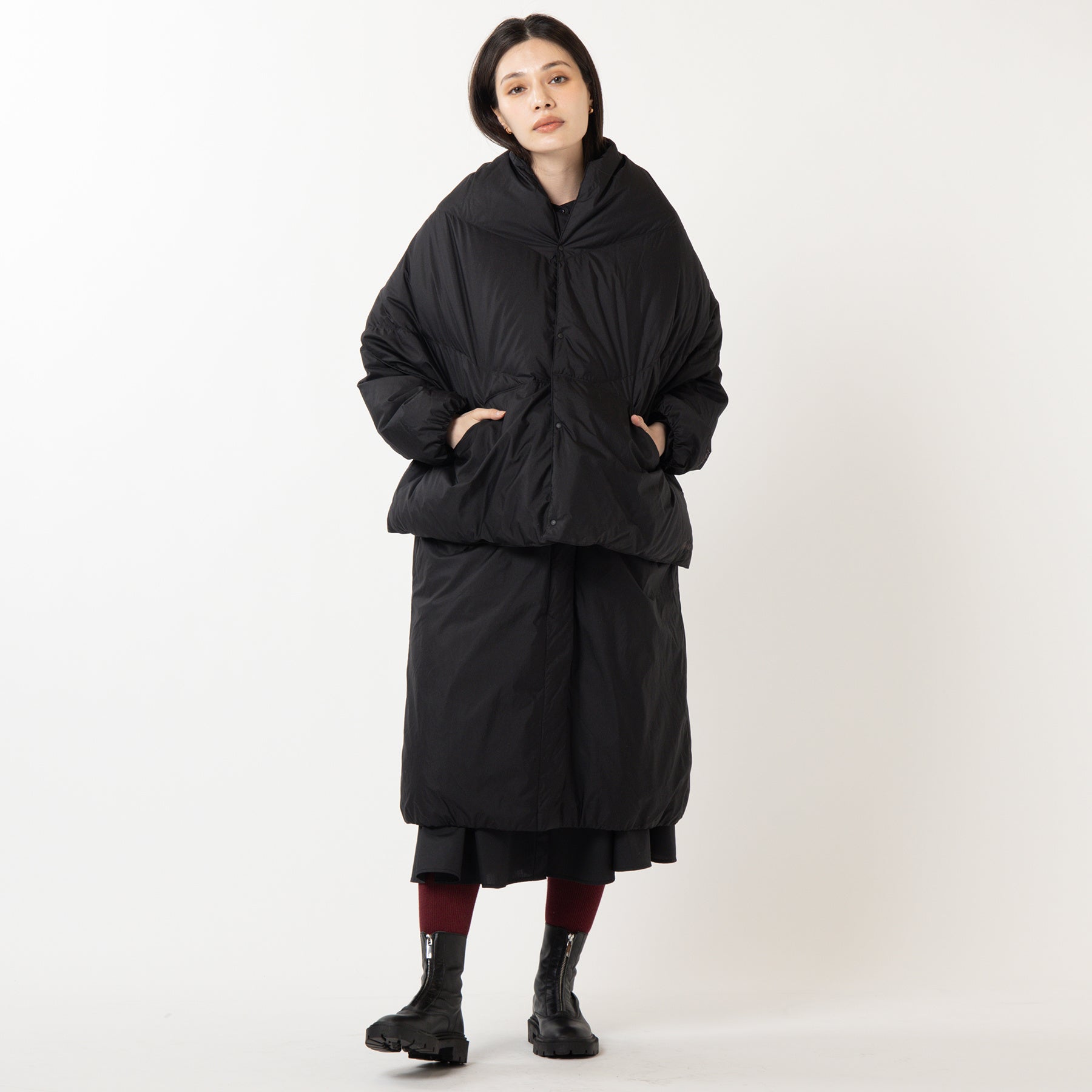 シーンを問わず着用できる、ノーカラーダウンコート。肩の切り替えやキルトステッチも無いほどシンプルなデザインにまとめ、ナチュラルで優しい雰囲気に仕上げました。表地は軽い質感のナイロン生地で、共布のダウンマフラーポンチョもラインナップしています。