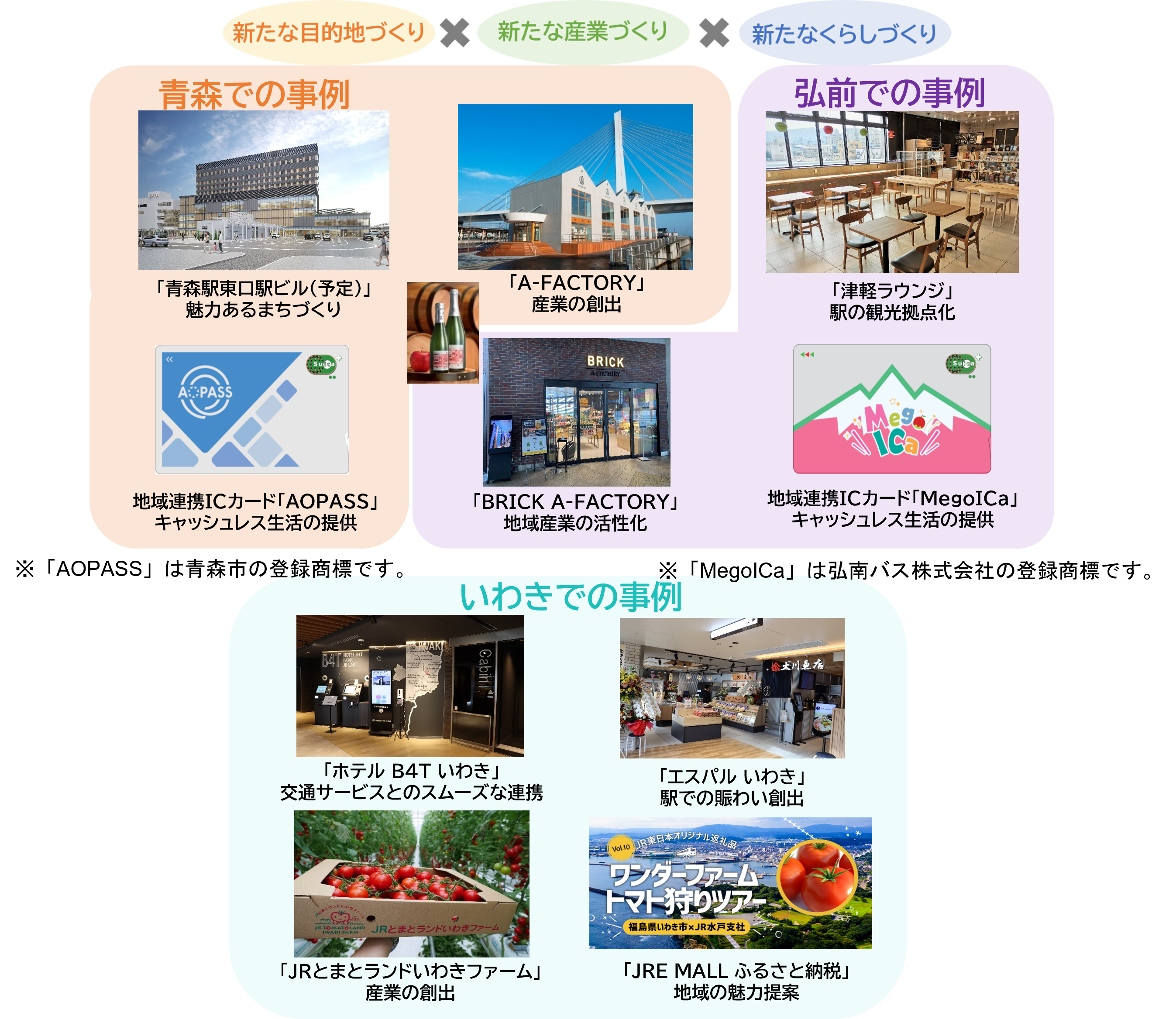 ・青森・弘前では地産のりんごを活用したシードル工場を展開し、地域産業の活性化を促進 ・地域連携ICカードにてキャッシュレス化を推進 ・いわき駅ではB4Tによる労働力不足解消を目指したホテルを運営し、地域に根差した地産物販売を行う駅ビルも開業 ・JRとまとランドいわきファームでは新たな産業の創出とJRE MALLふるさと納税による返礼品ツアーも実施 |
