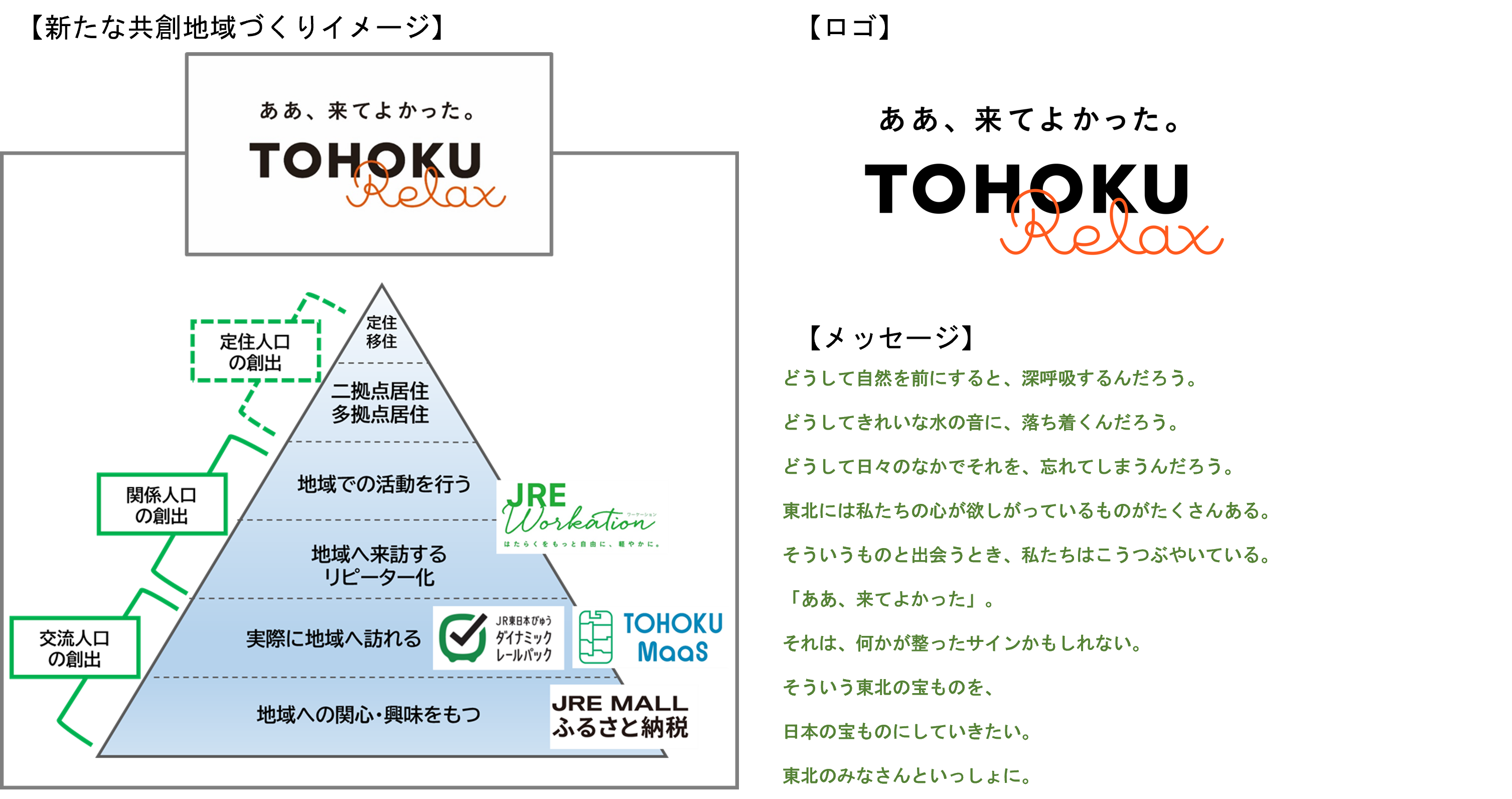 〇JR東日本グループはグループ経営ビジョン「変革2027」で掲げる「地方を豊かに」の実現に向け、JR東日本グループの資源を幅広く活用し、東北に訪れるきっかけづくり・産業づくり・くらしづくりを通じて、新たな地方創生を目指します。 〇地域の皆さまとともに東北の未来づくりに取り組むため、このたび「東北の宝ものプロジェクト」を始動します。 〇新たなブランド『TOHOKU Relax』を掲げ、そのスタートとしてこのブランドを冠して東北に数多くある「宝もの」の情報発信を行い、国内外からの流動を促進します。 |