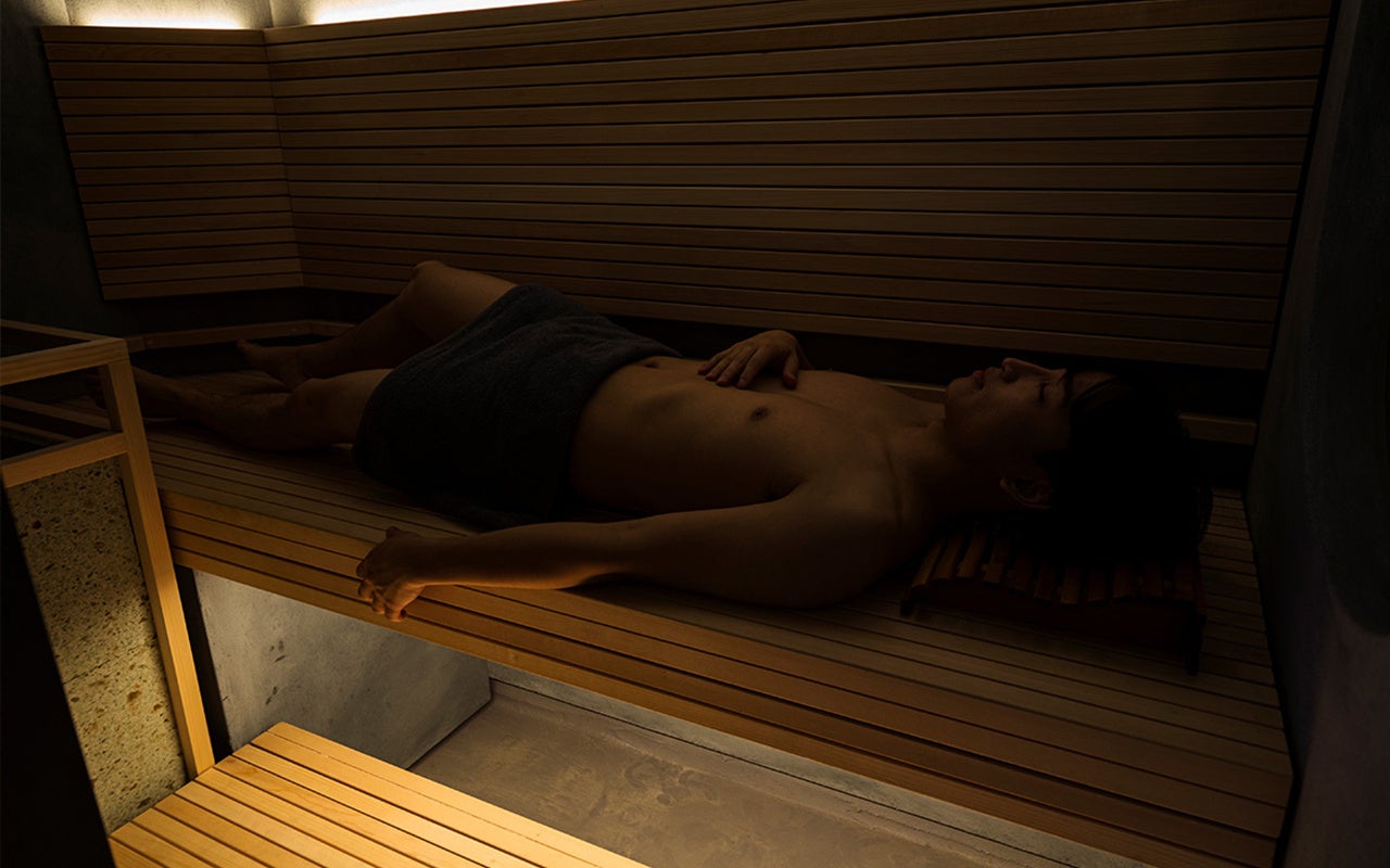 落ち着いた暗さの中で、屋久島の自然の音を聞きながらサウナベンチに横たわり、ゆっくりと汗をかくことでしっかりリフレッシュすることができます。適度なロウリュにより無理なくリラックスして入浴する事をおすすめしています。